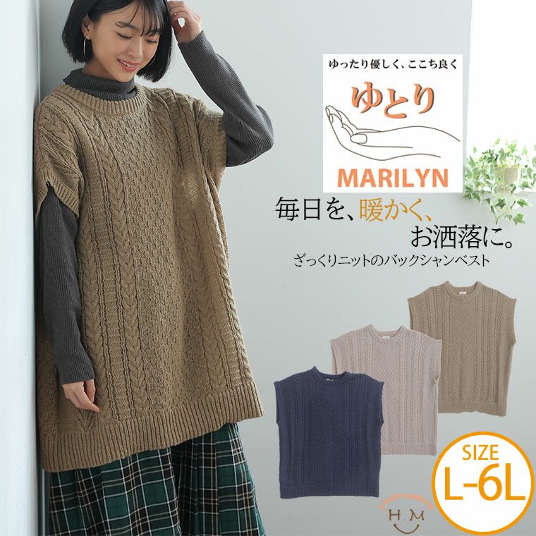 大きいサイズ 「ゆとりMARILYN」バックシャン ケーブル編み ベスト | 大きいサイズの通販ならハッピーマリリン