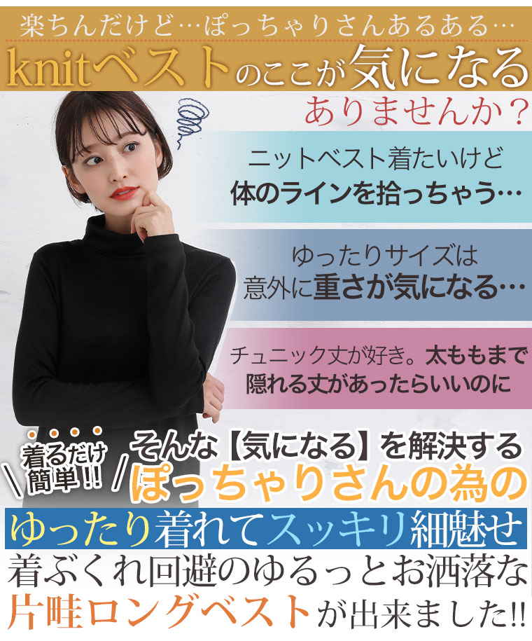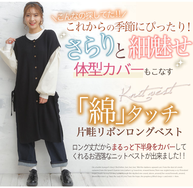 オリジナル ニットベスト LL 3L 4L 5L 6L 春 春物 春服 ぽっちゃり ゆったり お腹 太もも 胸周り お尻 腰周り 綿タッチ 洗える2way 片畦 Vネック 脇リボン ウォッシャブル ニット ロング ベスト