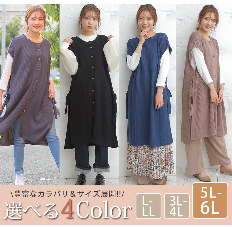 4. 大きいサイズ 洗える2way 片畦 Vネック 脇リボン ウォッシャブル ニット ロング ベスト