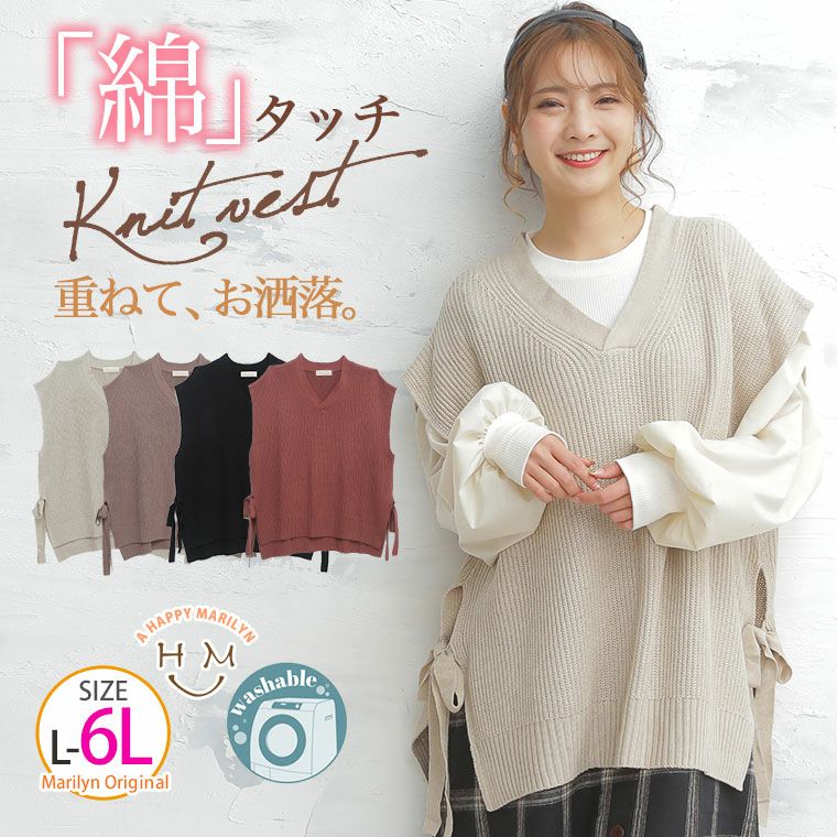 他の画像を見る オリジナル ニットベスト LL 3L 4L 5L 6L 春 春物 春服 ぽっちゃり ゆったり お腹 太もも 胸周り お尻 腰周り 綿タッチ 洗える 片畦 Vネック 脇リボン ウォッシャブル ニット ベスト | 大きいサイズの通販ならハッピーマリリン 価格 ¥ 2,790 税込 4.00 在庫切れ お気に入りに登録する