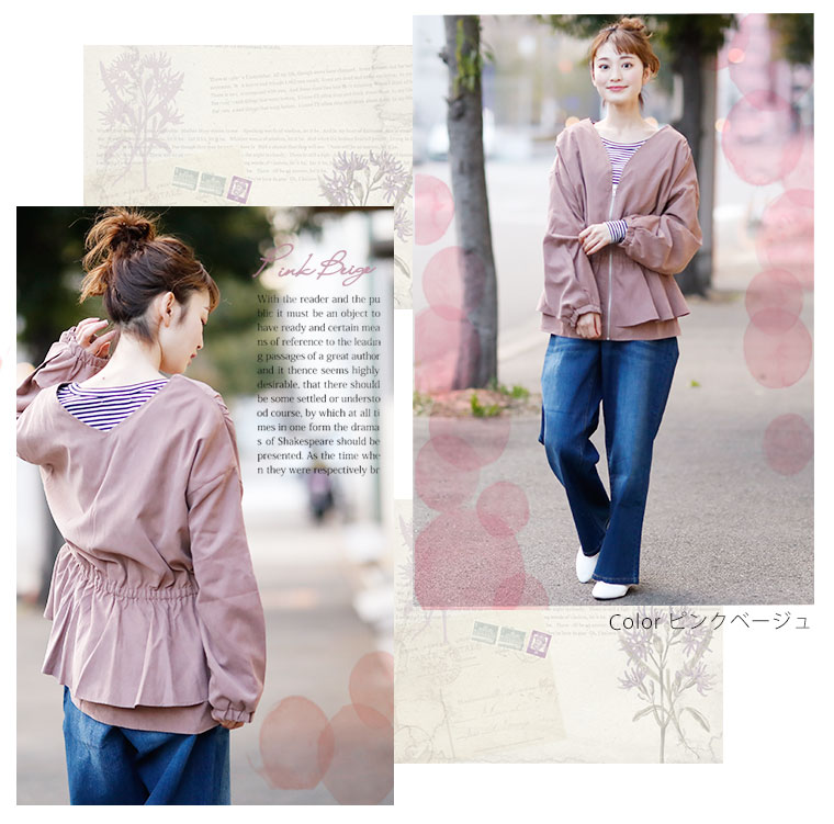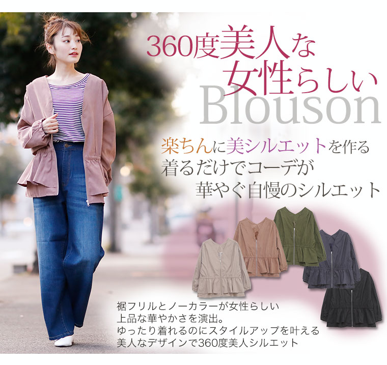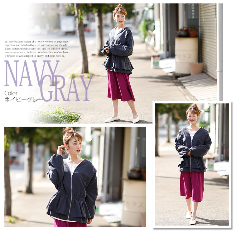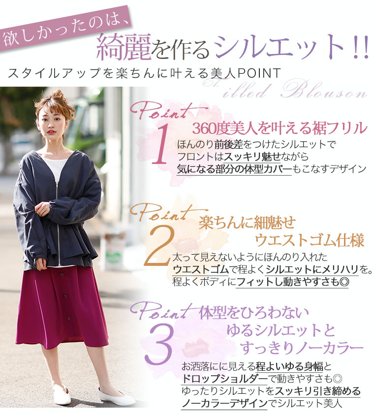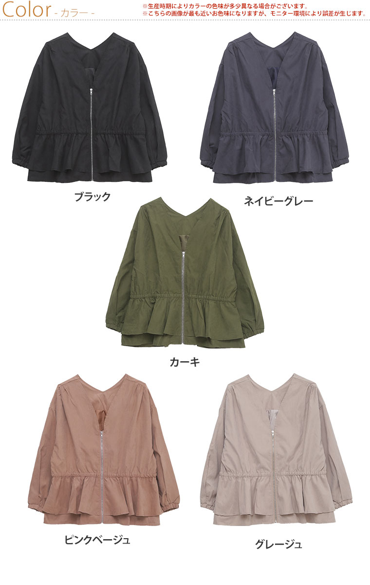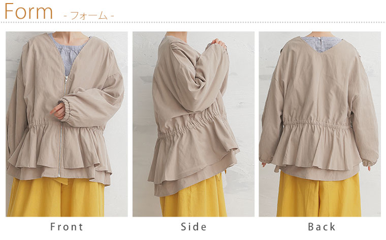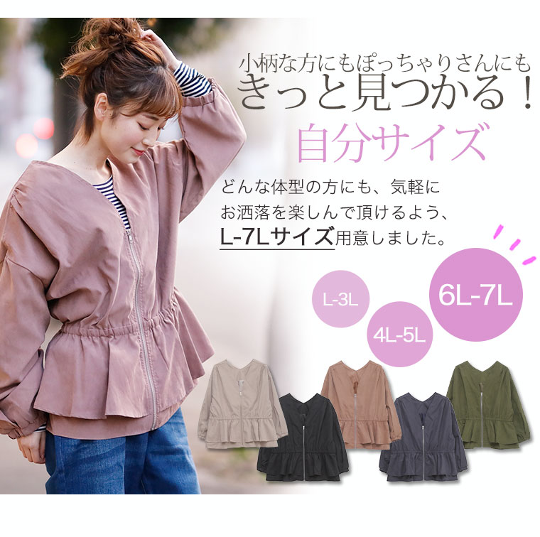 オリジナル ジャケット LL 3L 4L 5L 6L 7L 春 春物 春服 ピーチ ぽっちゃり ゆったり かわいい おしゃれ カジュアル 可愛い 大人 ガーリー ボリュームスリーブ 裾フリル 長袖 ノーカラー ブルゾン