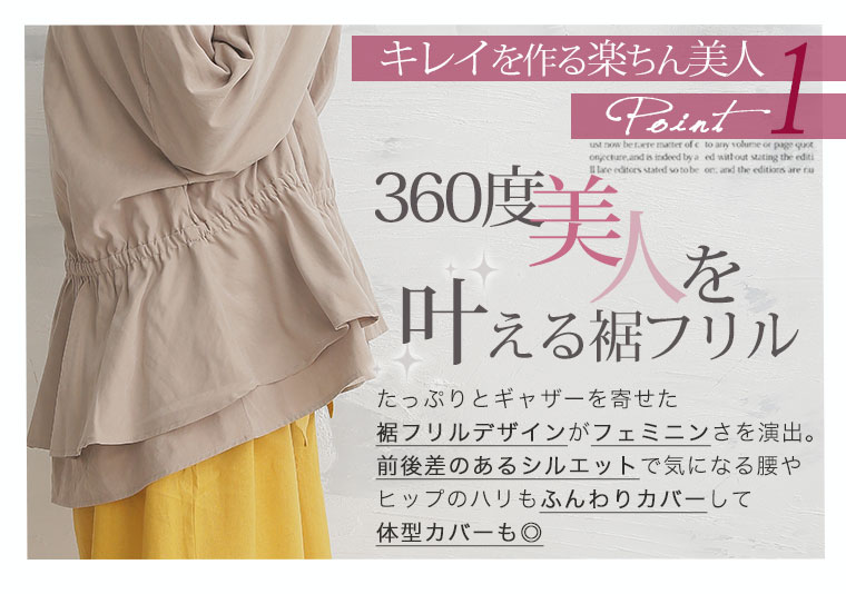 裾フリルでさりげなくお腹周りをカバー。軽い着心地のピーチスキンで着やすさ抜群