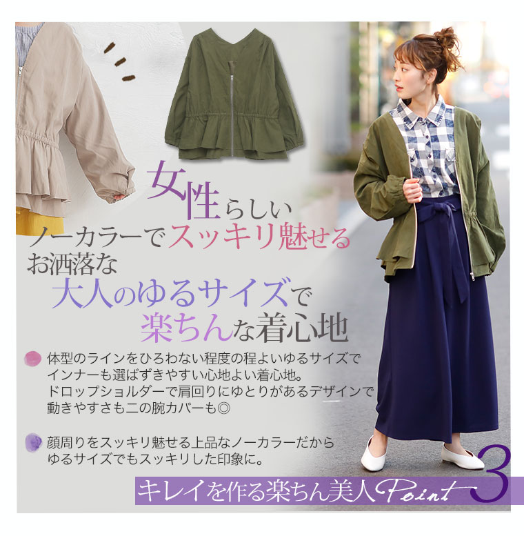 3. 大きいサイズ ボリュームスリーブ 裾フリル 長袖 ノーカラー ブルゾン
