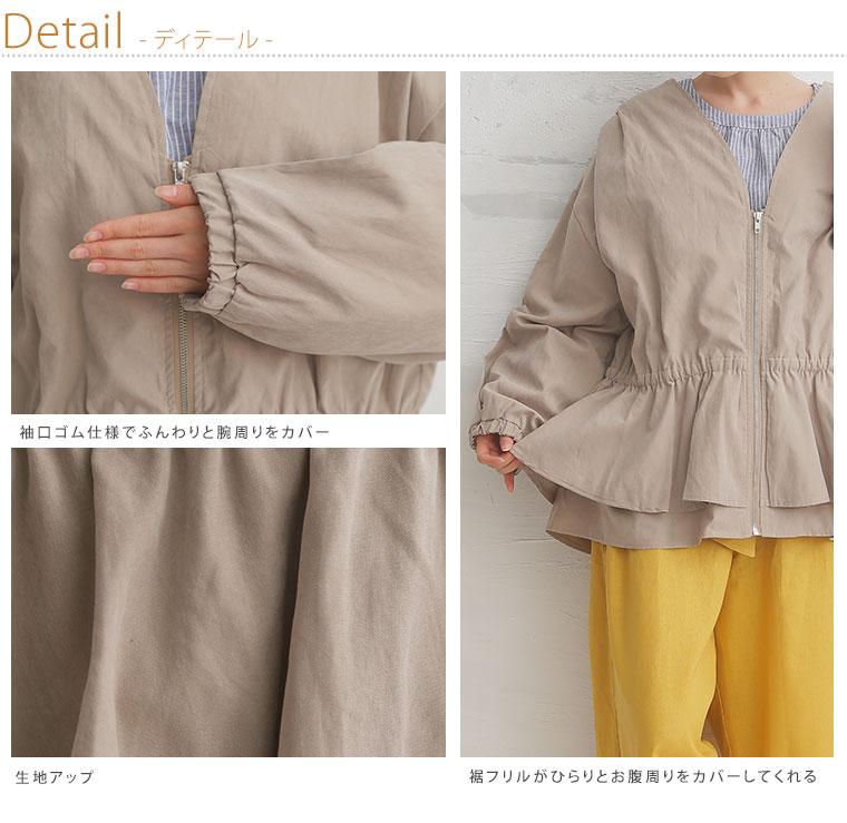 ゆとりをもって着用できました。裾のフリルが可愛くてお腹周りもしっかりカバーしてくれますね。とても女性らしいブルゾンです。