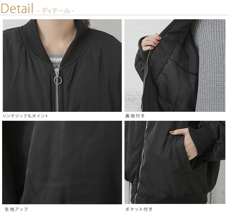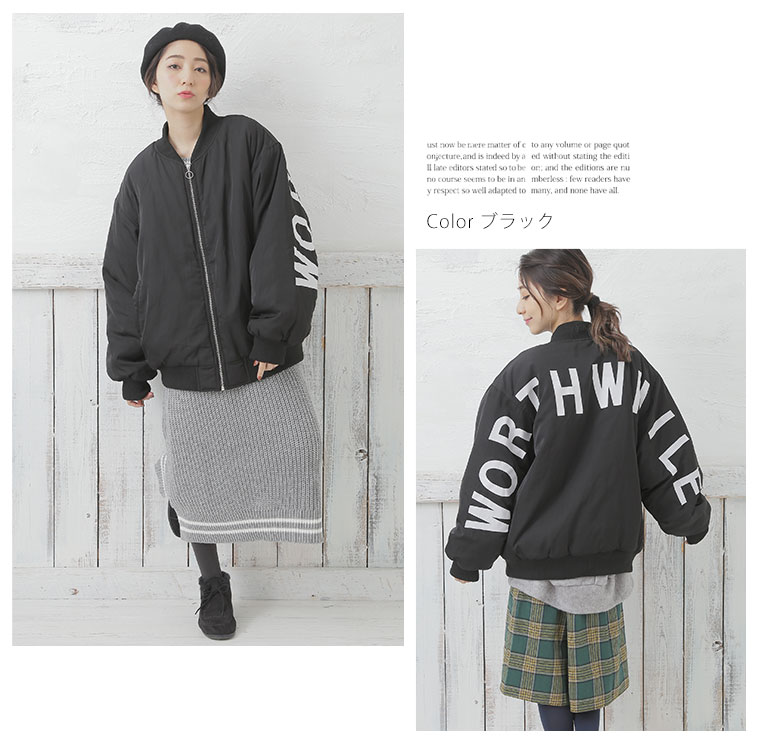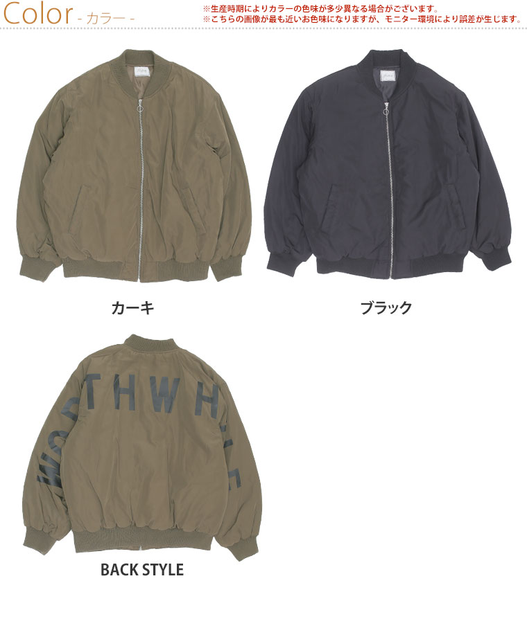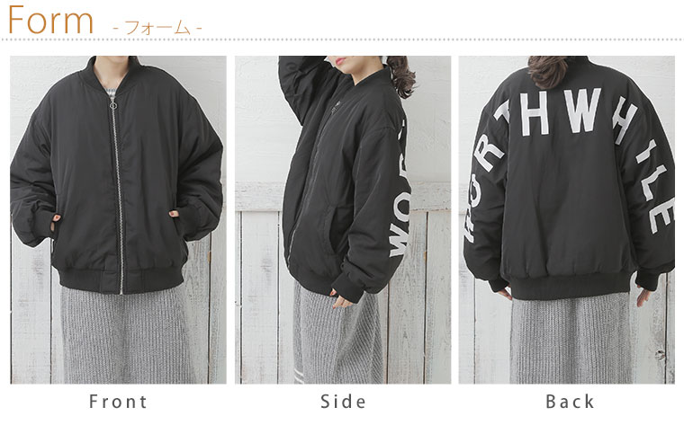 バックスタイルに大きなロゴ入りで後ろ姿も可愛く。リングジップ中綿MA-1ミリタリーブルゾン