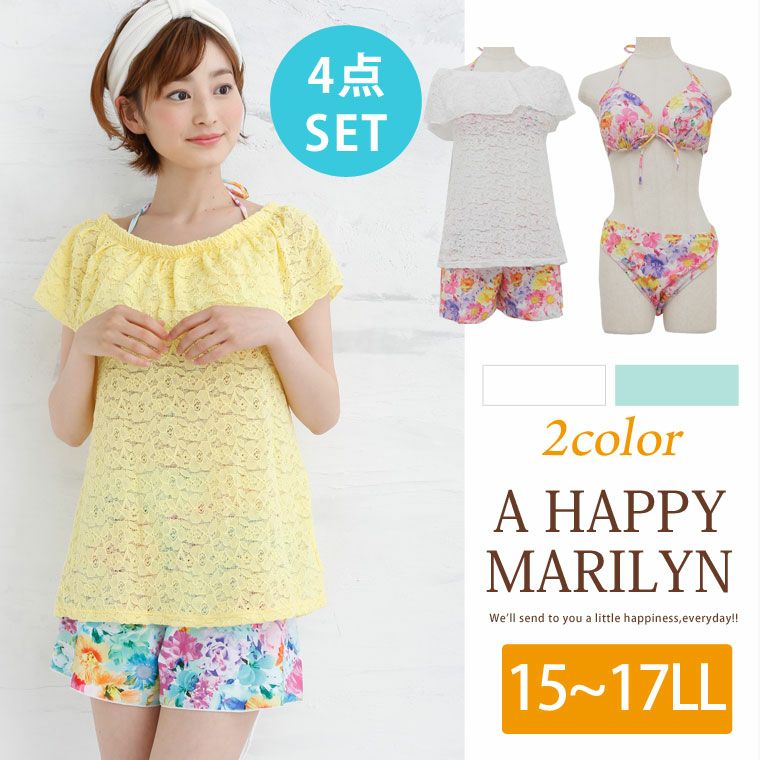 レースフレアで華やかな着こなしに。カラフル花柄水着4点セット