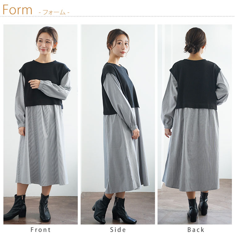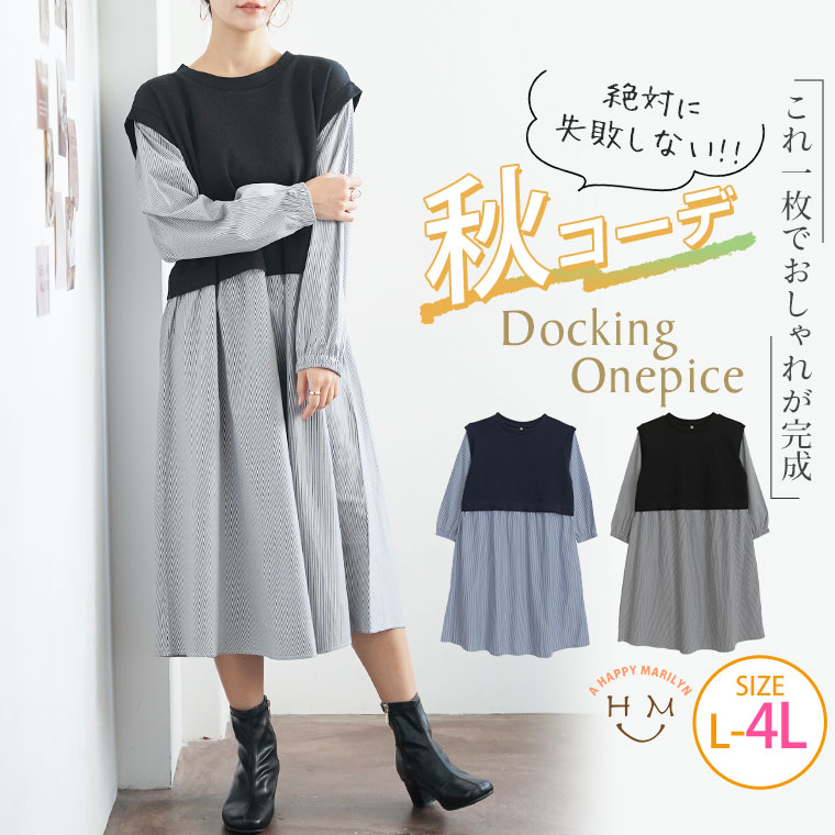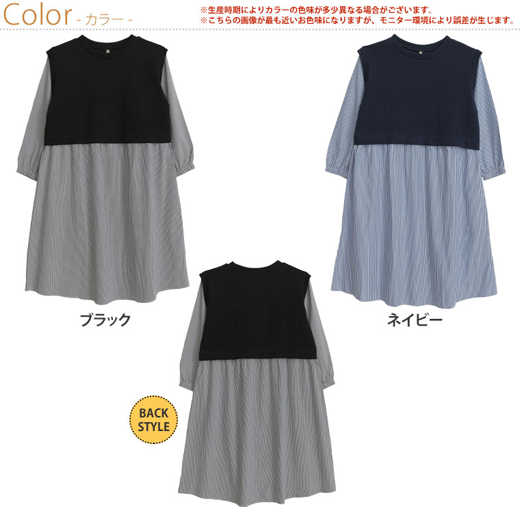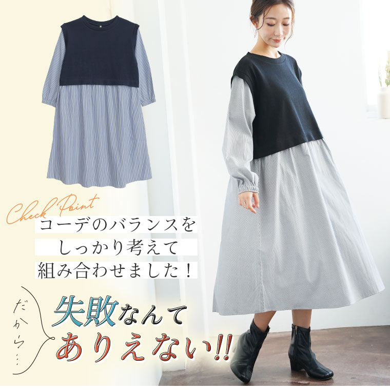 ワンピース ワンピ デザインワンピ ドッキング LL 3L 4L 秋 秋物 秋服 冬 冬物 冬服 ぽっちゃり ゆったり プラスサイズ かわいい おしゃれ カジュアル ナチュラル ベスト フェイク シャツ ワンピース