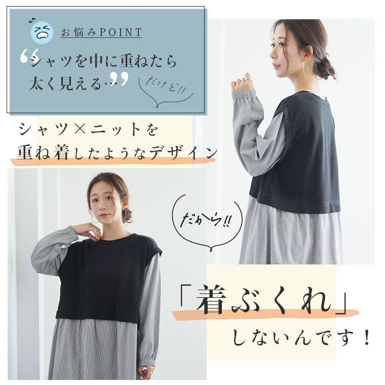 ニット×カットソーで着ぶくれの心配0 体型カバーできるドッキングデザイン