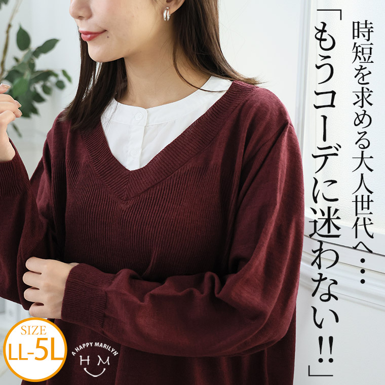 5. 大きいサイズ バンド襟 シャツ フェイクプルオーバー