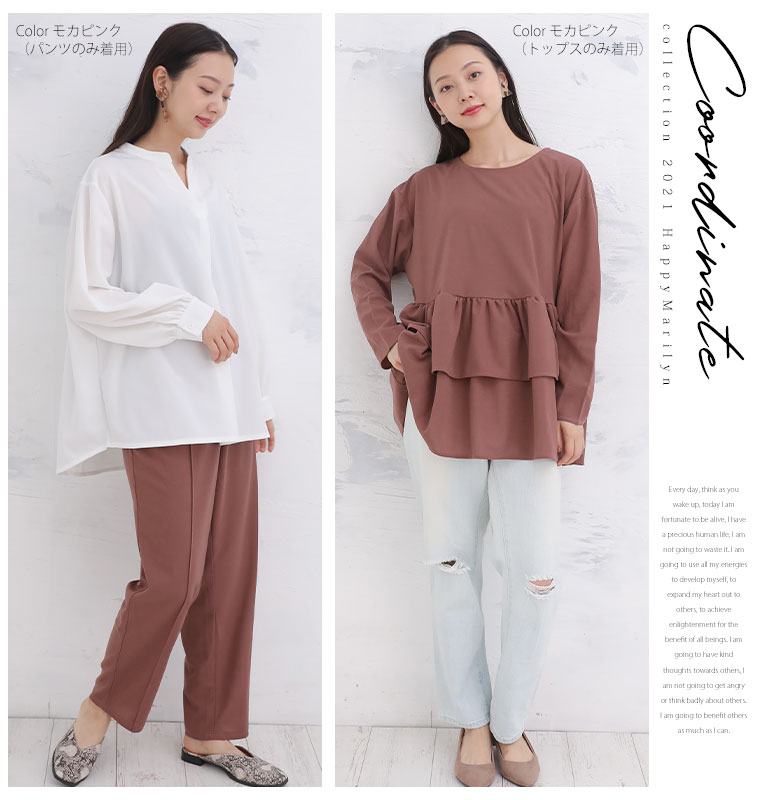 身長:169cm 購入サイズ:5L~6L 着用感:ちょうど良い ストレッチ感:普通 カラーについて:モカピンク セットアップの服を持っていないので購入しました。くすんだピンク色がかわいいです。 生地は薄めです。上は長袖のため春秋、パンツは春夏秋と使えると思います。 私は胸が大きいのですが、フリルがイメージよりも上の方に来てしまい、相対的に丈が短くなってしまいました。ですが、気になるお腹周りはうまくカバーされていたので良かったです。 セットアップで使うもよし、ほかの服と組み合わせてもよしという欲張りセットなので、かなりおすすめです。
