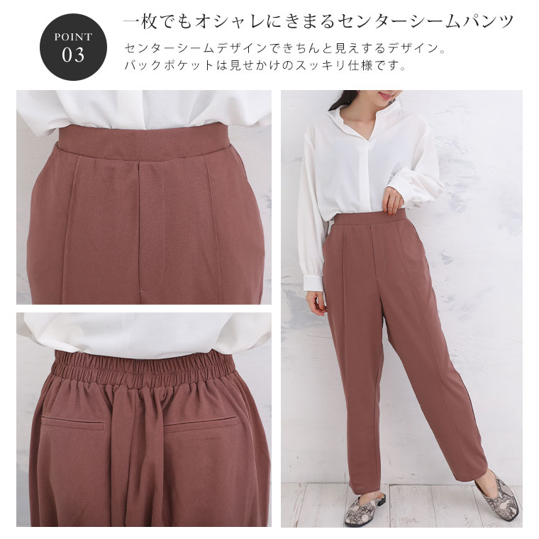 きれいめに見えますが、伸びる素材なので窮屈感なく着られます。パンツはスッキリ見えるシルエットです。