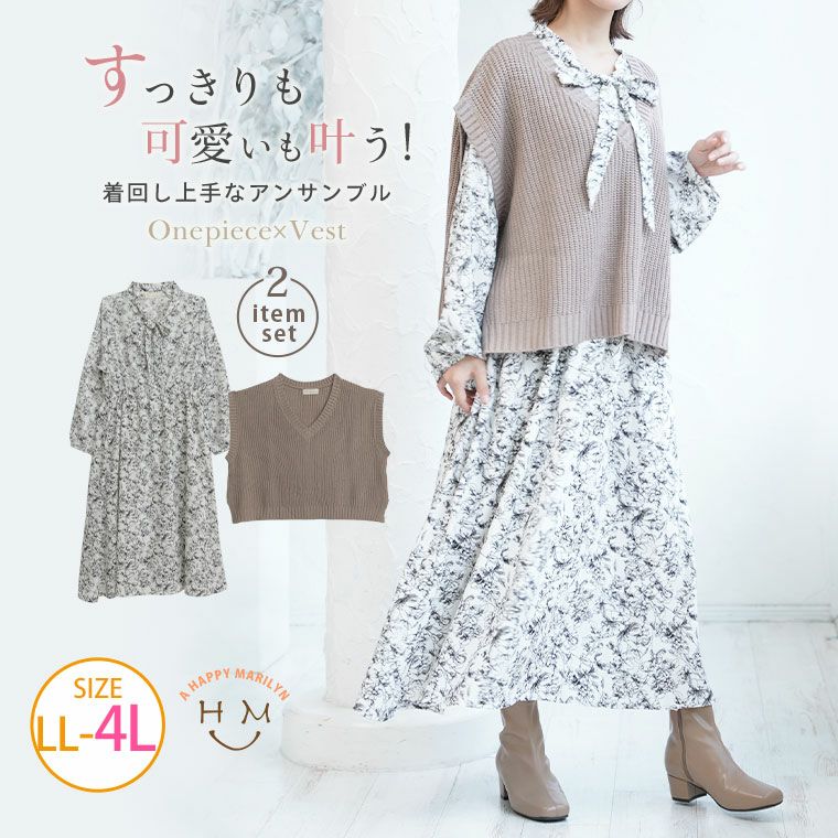 すっきり可愛い花柄ワンピース×ベストの2点SET