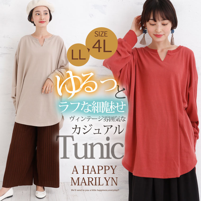 トップス チュニック LL 3L 4L 冬 冬物 冬服 ぽっちゃり かわいい カワイイ 可愛い オシャレ お洒落 おしゃれ カジュアル ナチュラル 表起毛 天竺 キーネック 長袖 チュニック