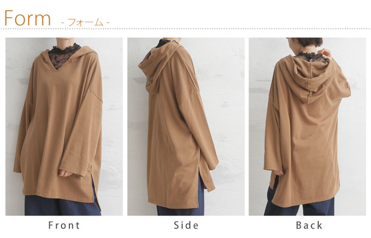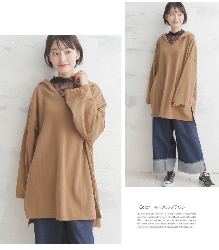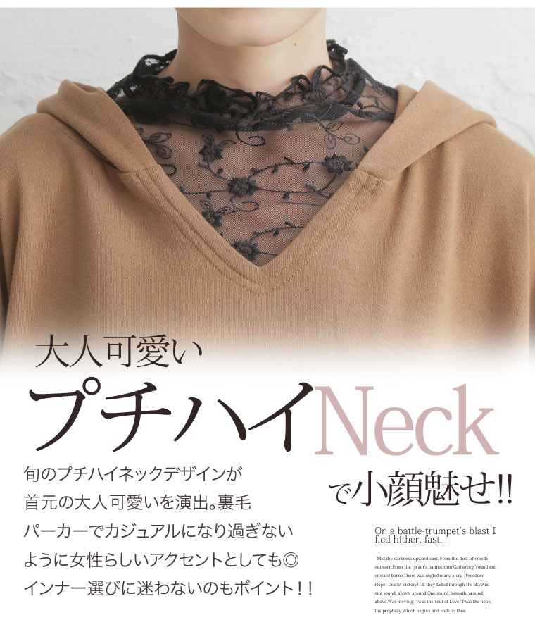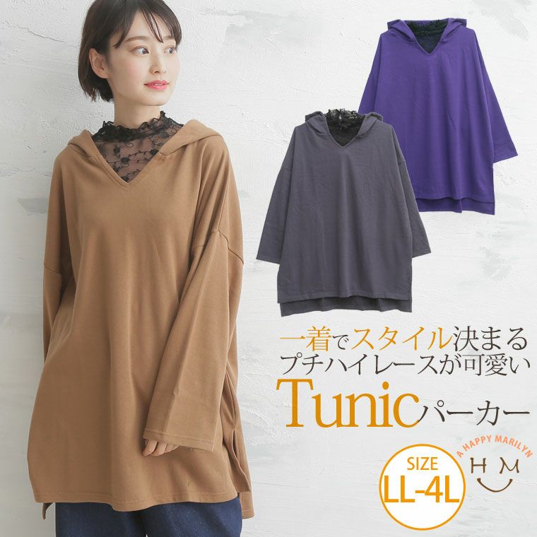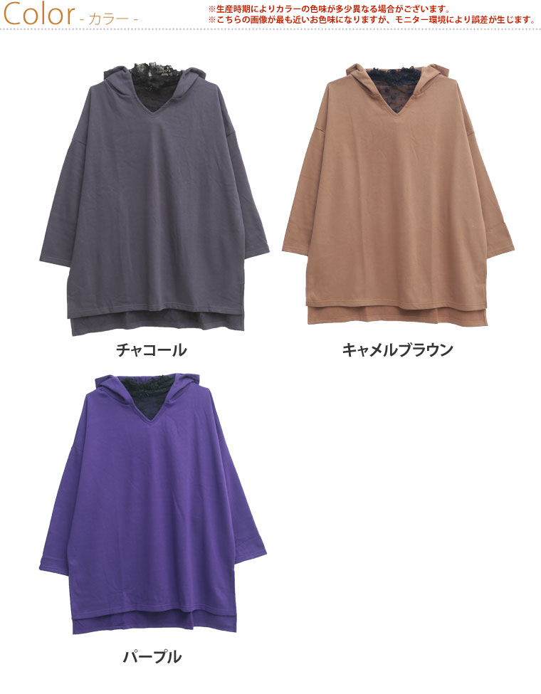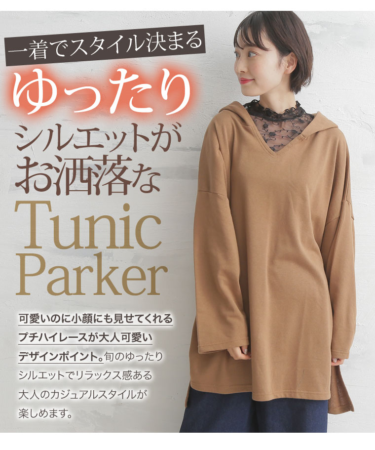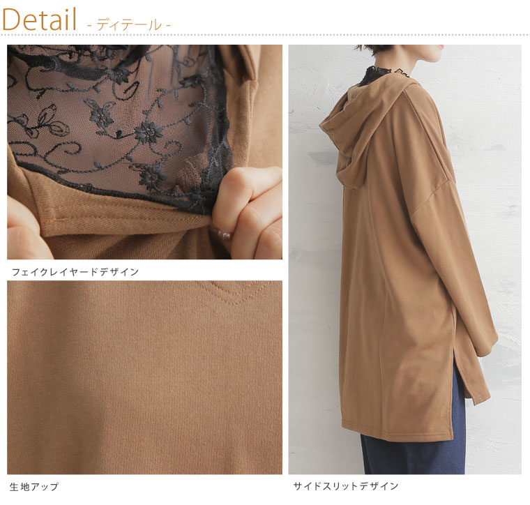 ネックラインを華やかに飾るチュールレースがアクセント!!レイヤード風チュニックパーカー
