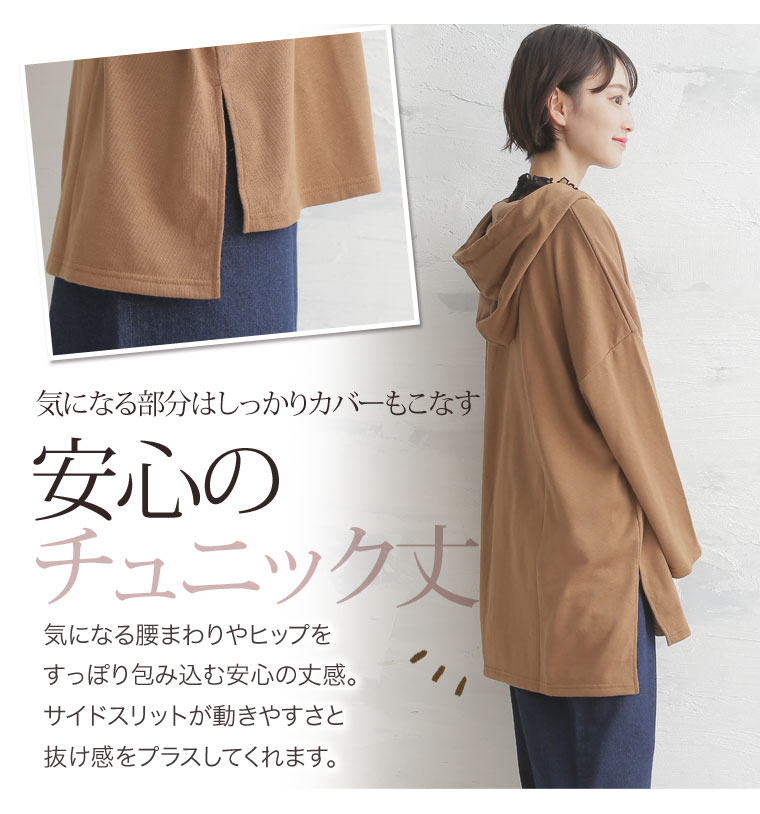 スリット入りのパーカーで程よい抜け感をプラス。シンプルデザインでバツグンの着回し力が魅力。