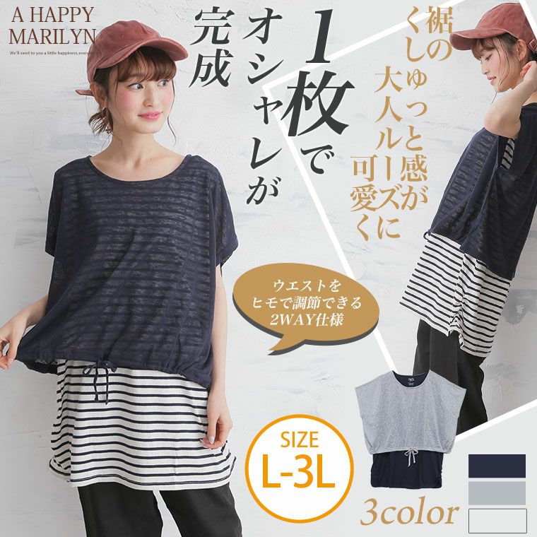 1枚でコーディネートの完成!!スラブ生地Tシャツ×裾シャーリングチュニックフェイクレイヤードデザイン