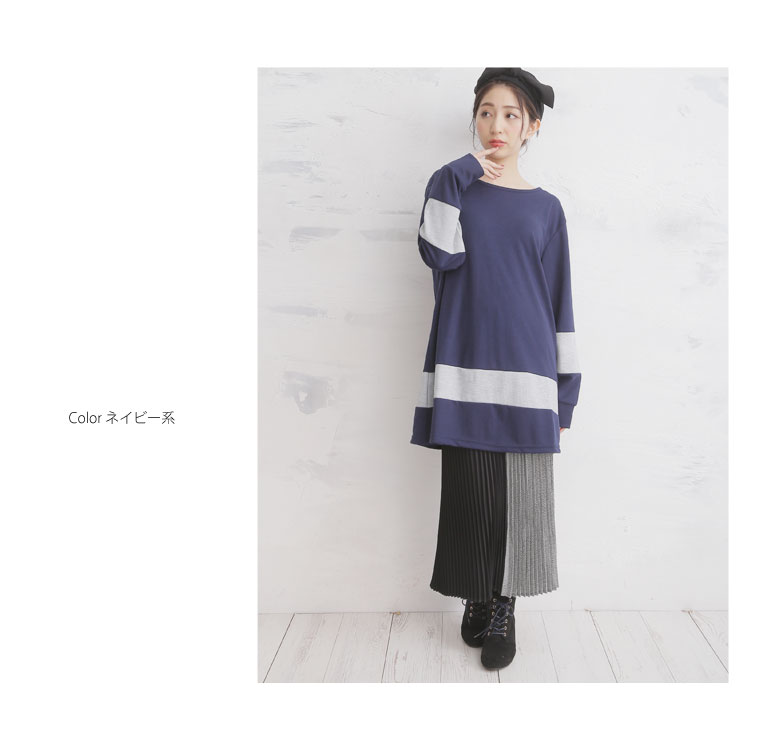 5. 大きいサイズ 配色切替 長袖 Aライン チュニック