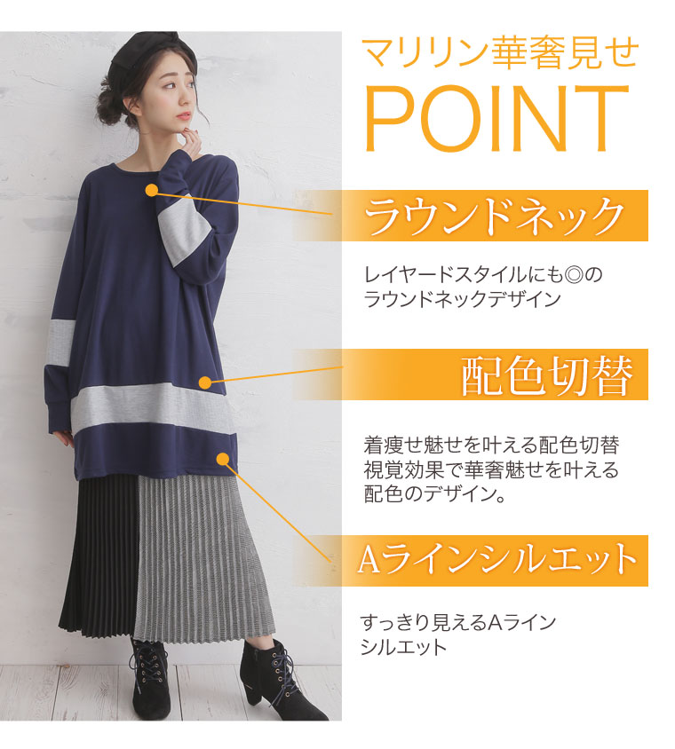 4. 大きいサイズ 配色切替 長袖 Aライン チュニック