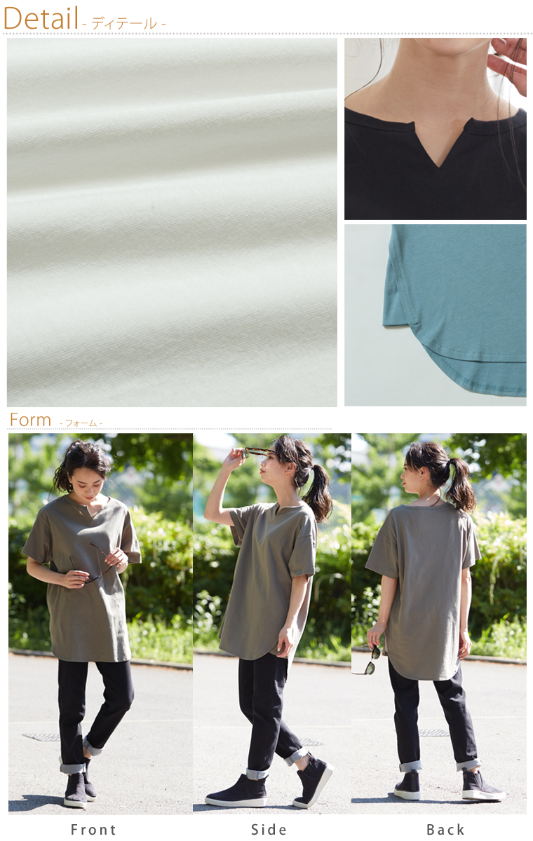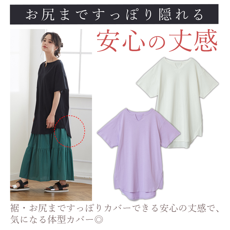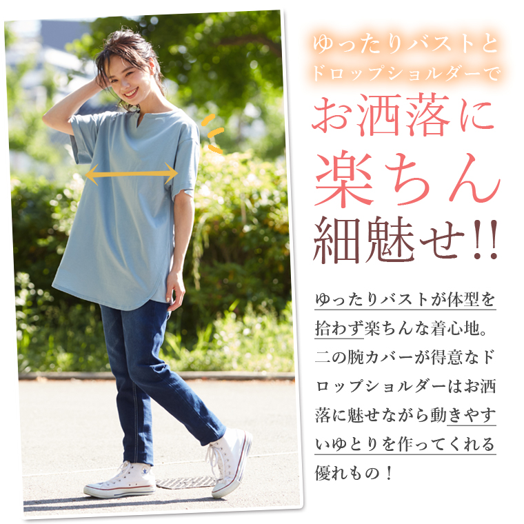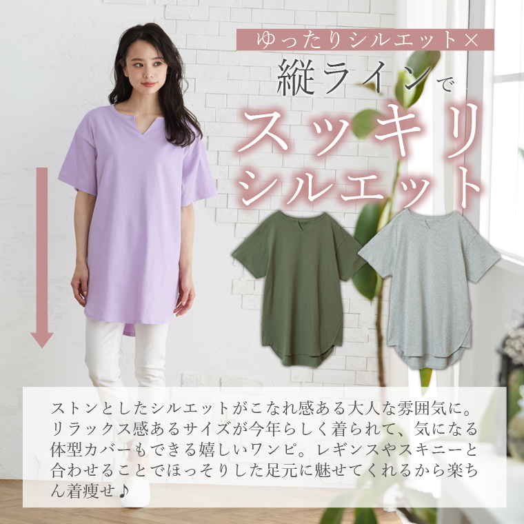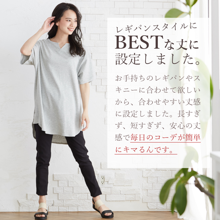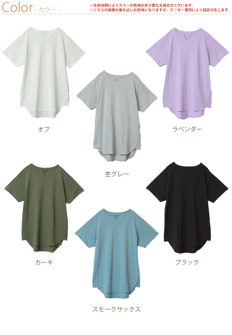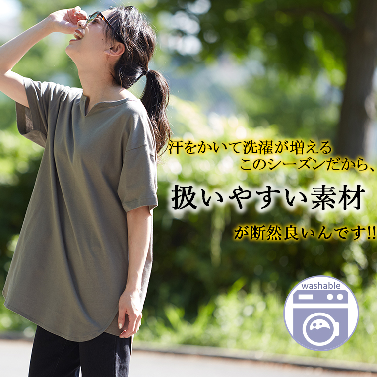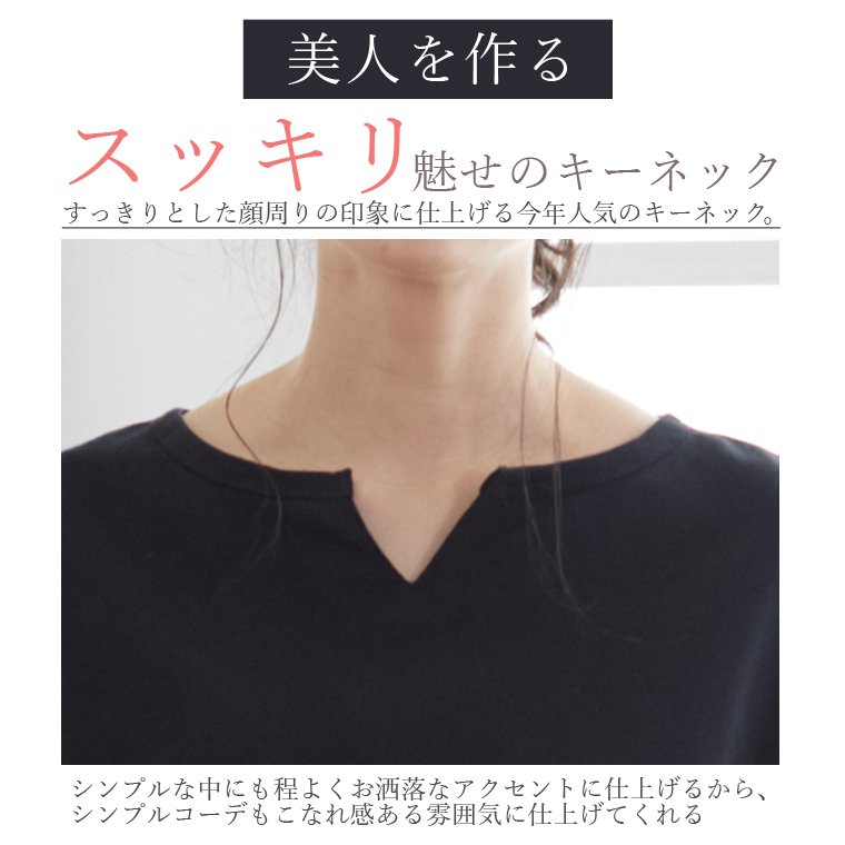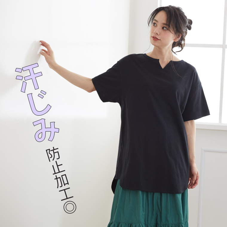 汗ジミ防止でこれからの季節に大活躍!キーネックでトレンド感◎ゆったり縦ラインで体型カバーまで叶う1枚です。