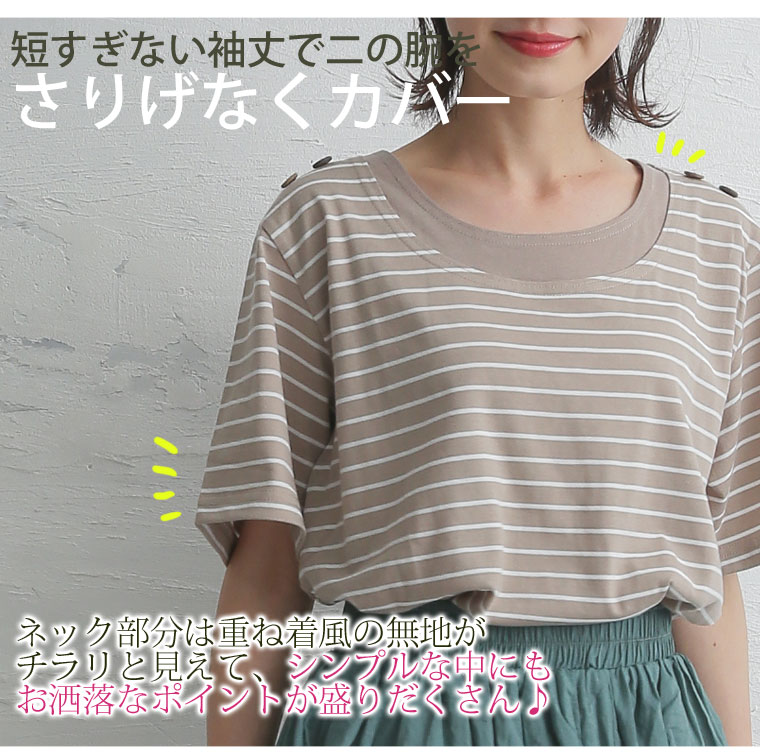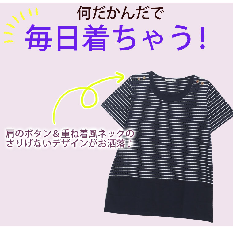 肩のボタンと重ね着風のデザインが、定番のボーダーシャツをお洒落に格上げ♪