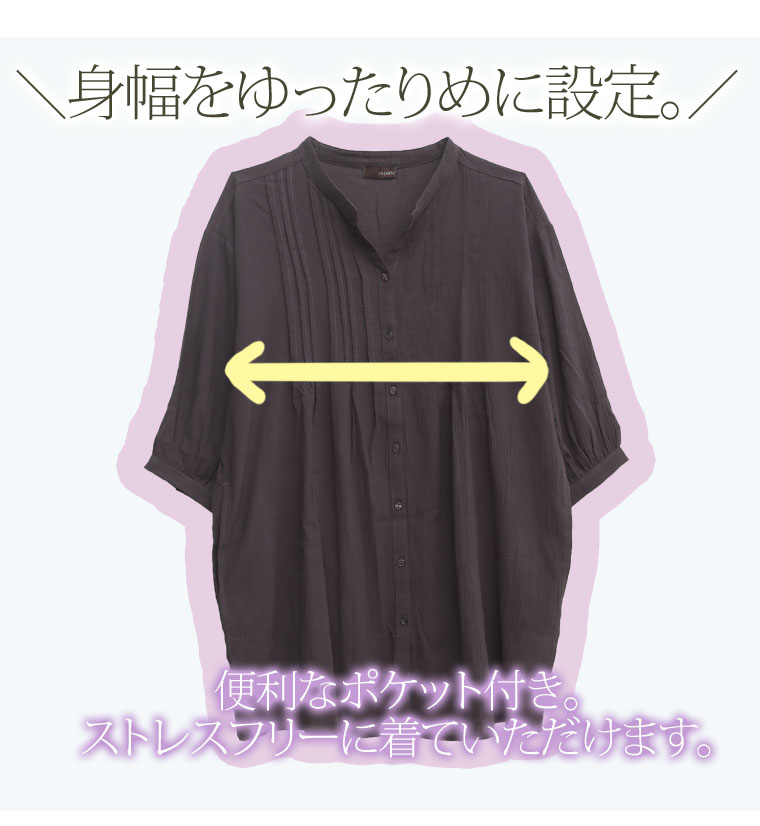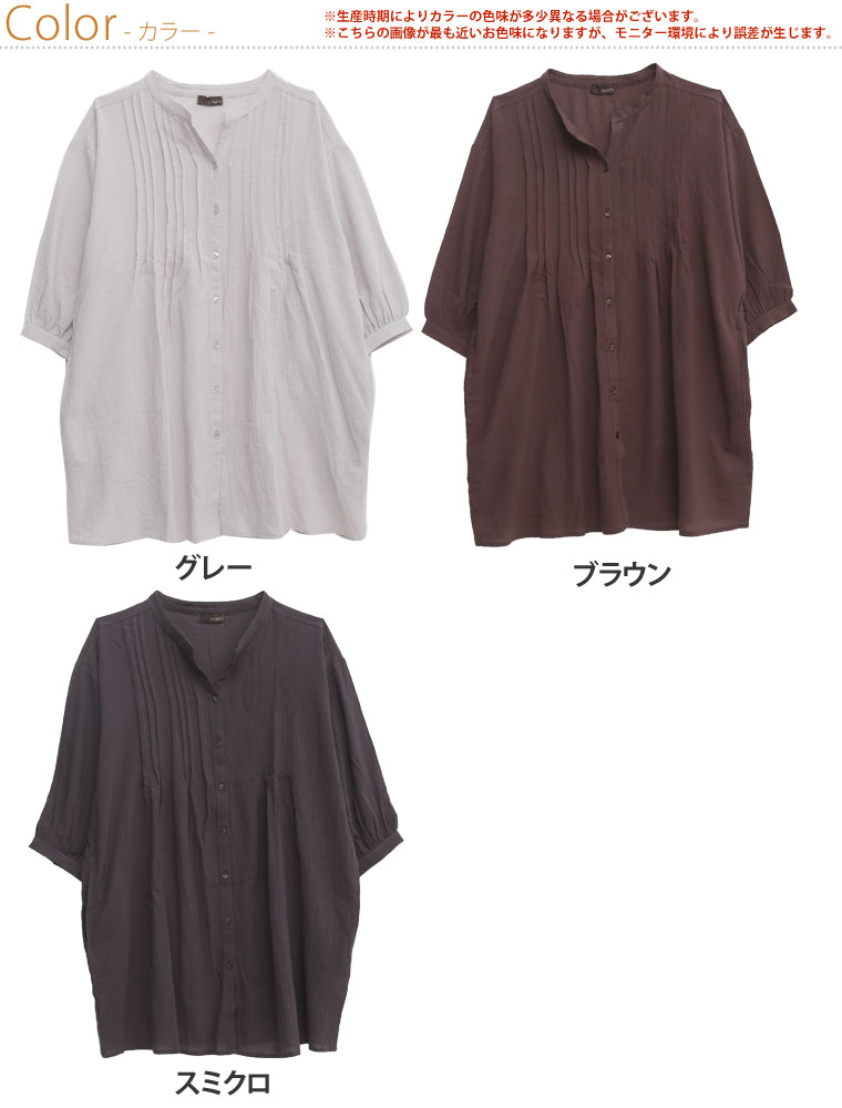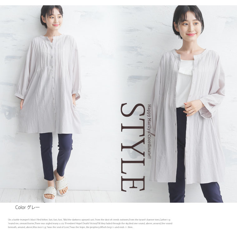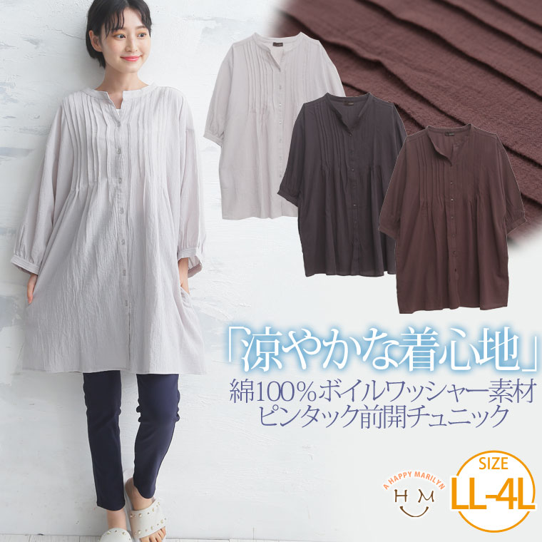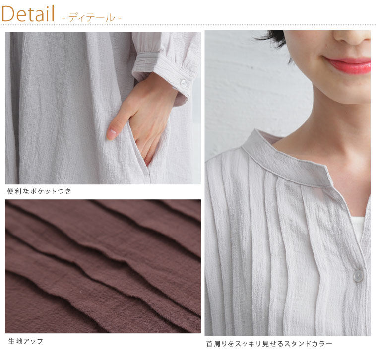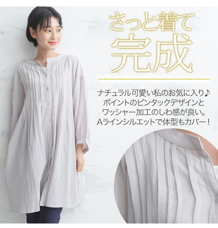 嬉しいポケット付き♪綿100%ボイルワッシャー素材ピンタック前開きチュニック