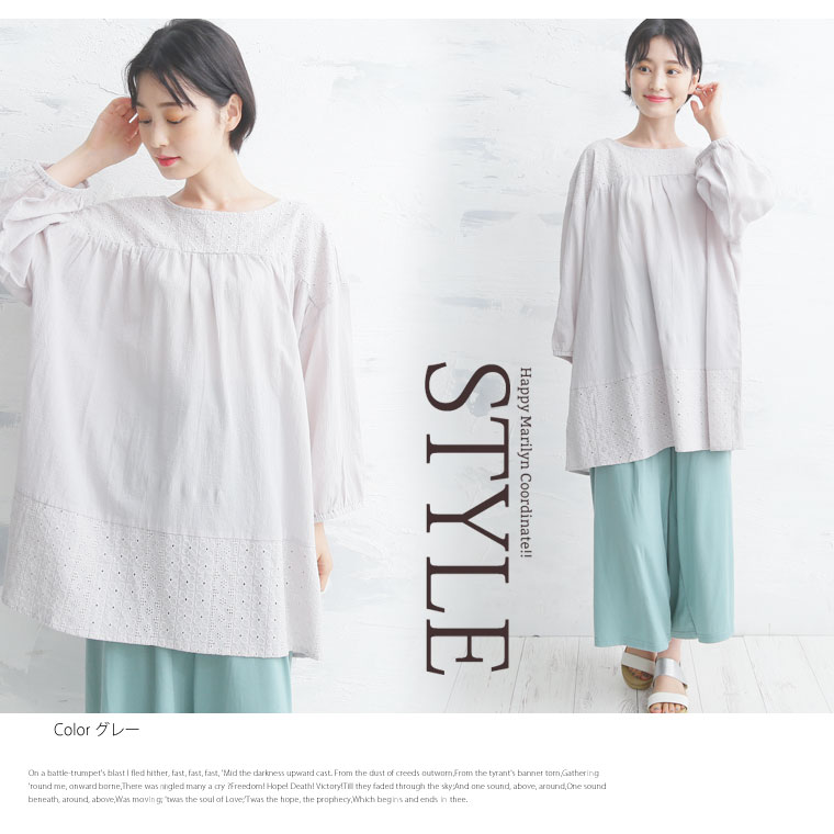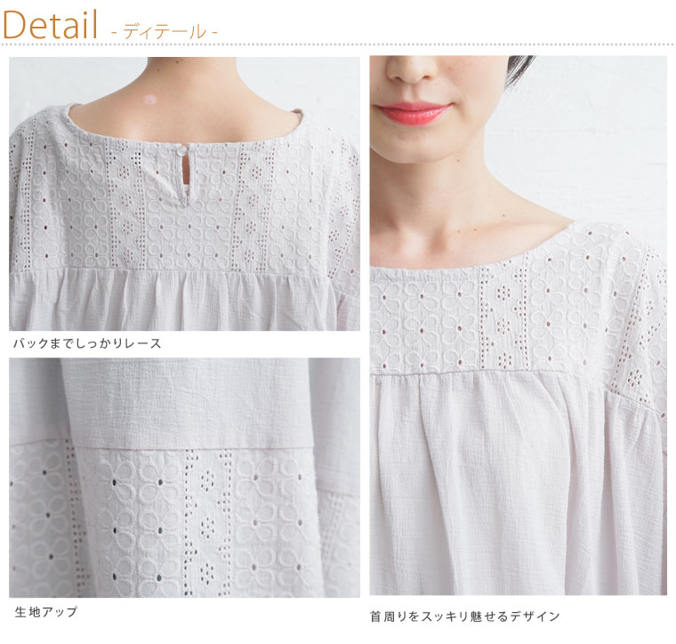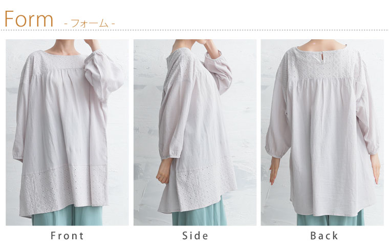 ゆったりなのにスッキリ見せる 綿100 ボイルワッシャー素材 レース切替チュニック