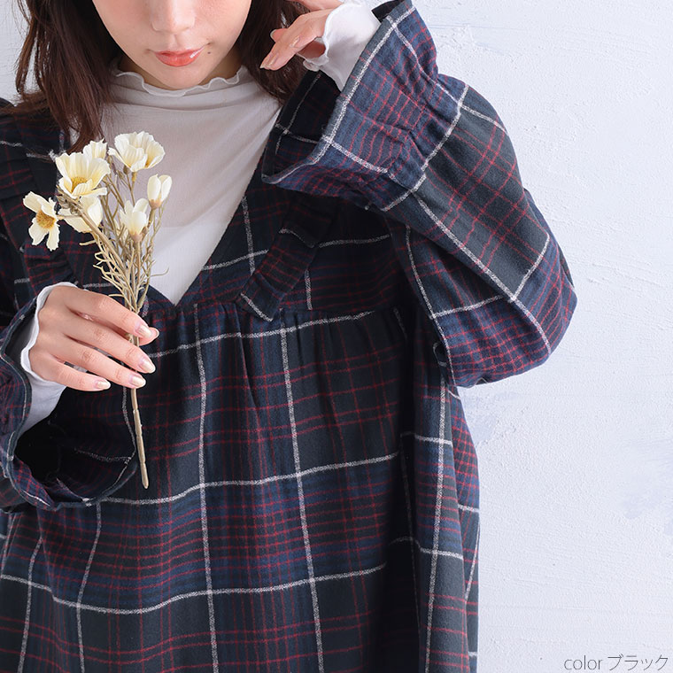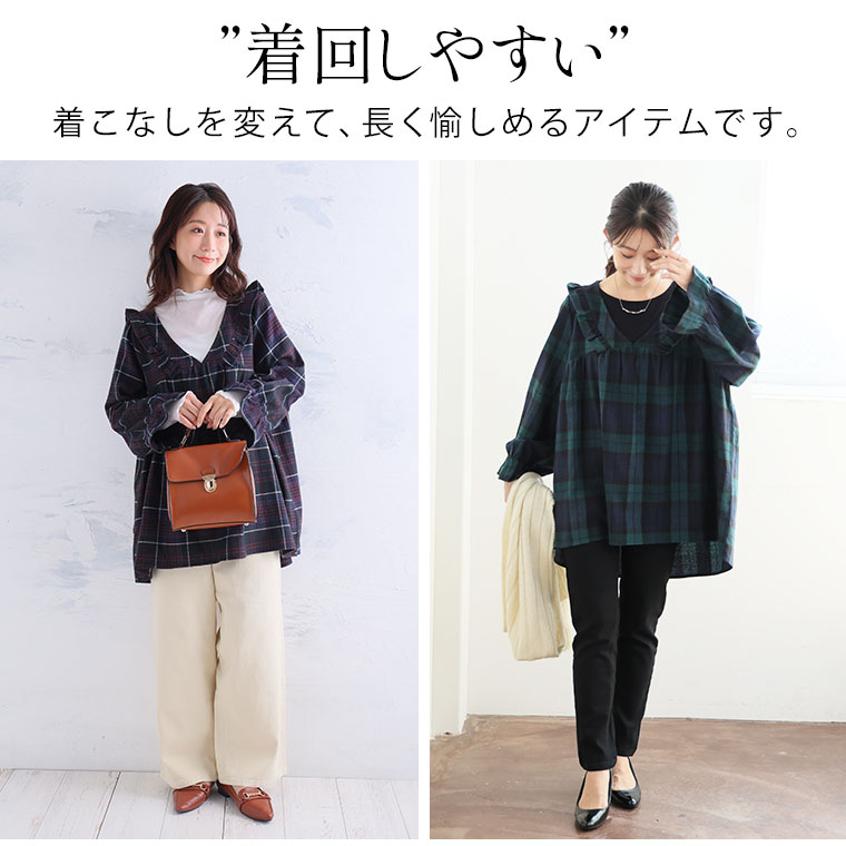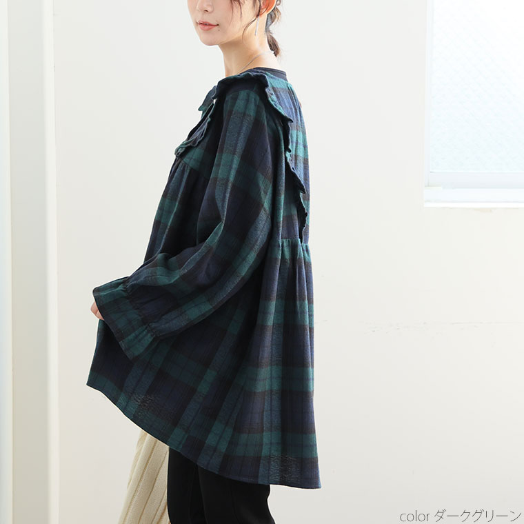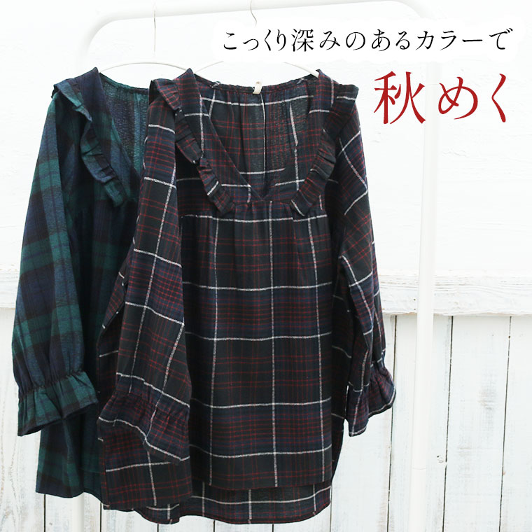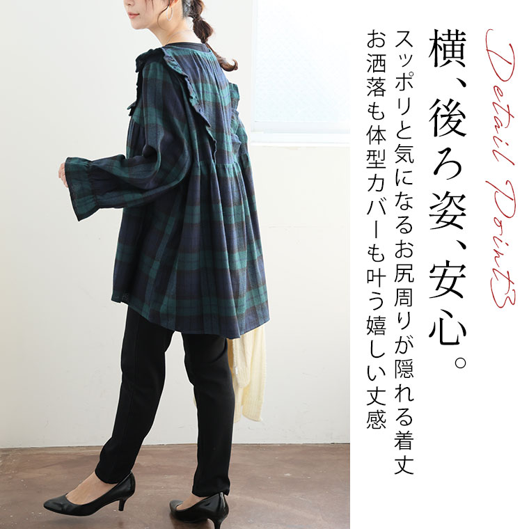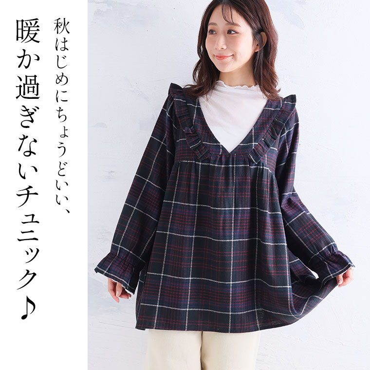 見た目秋、着心地さらりチェック柄ギャザーフリルチュニック