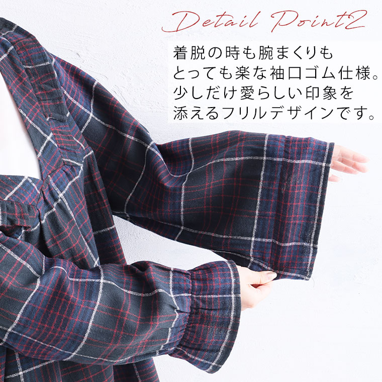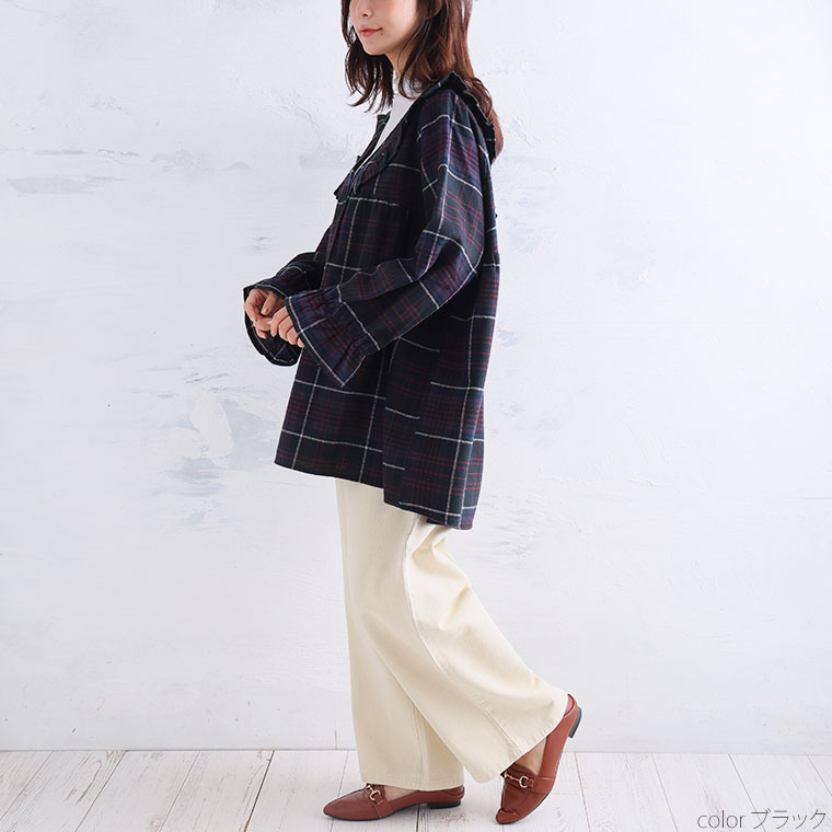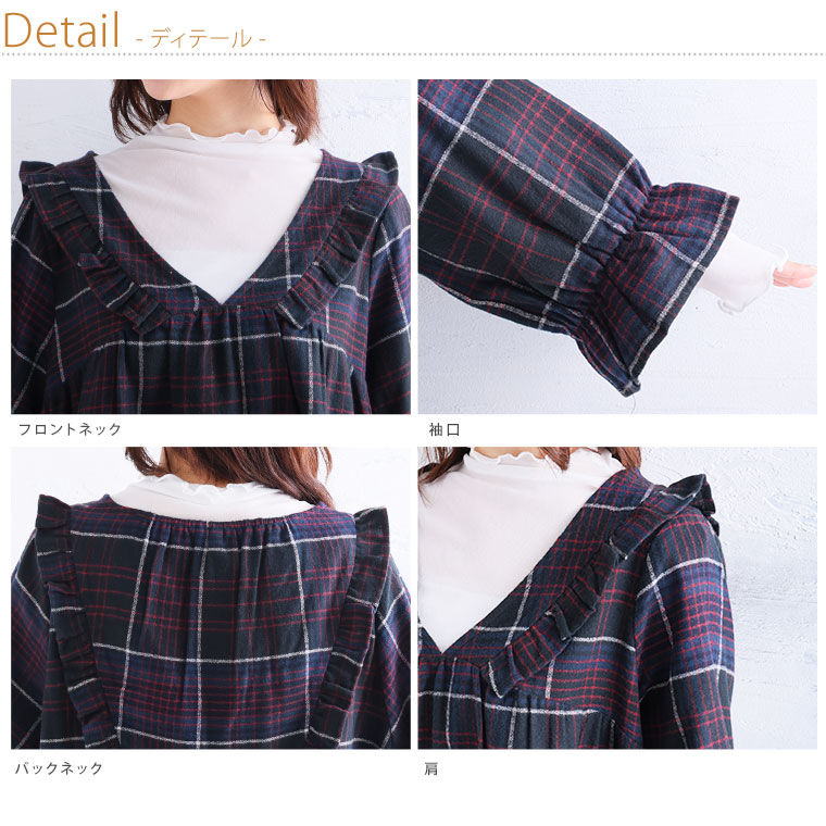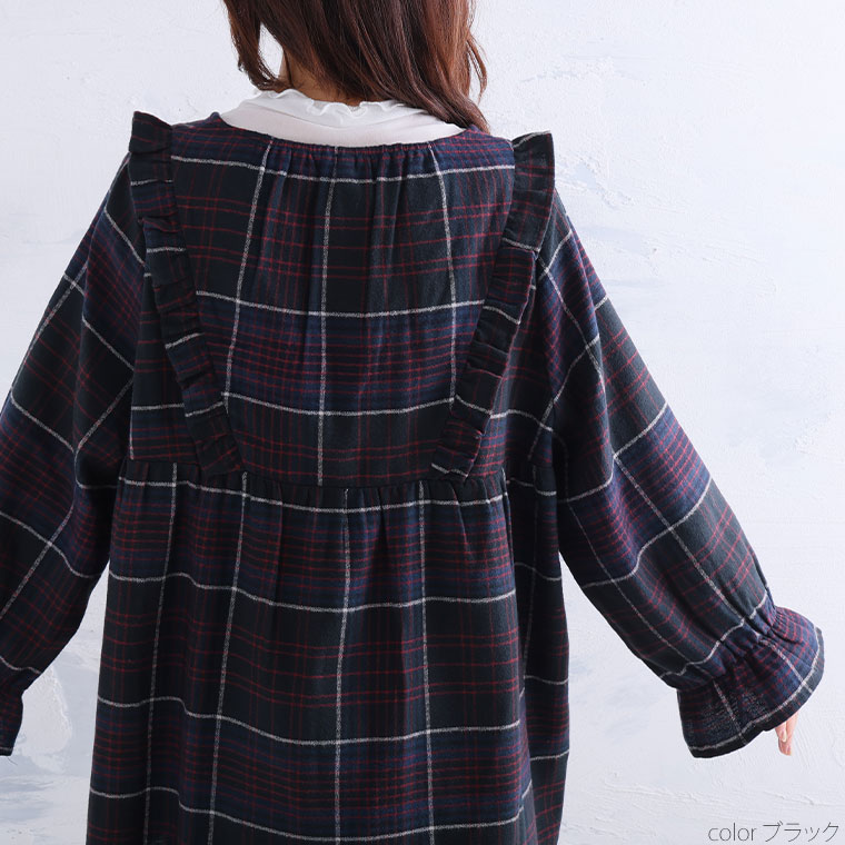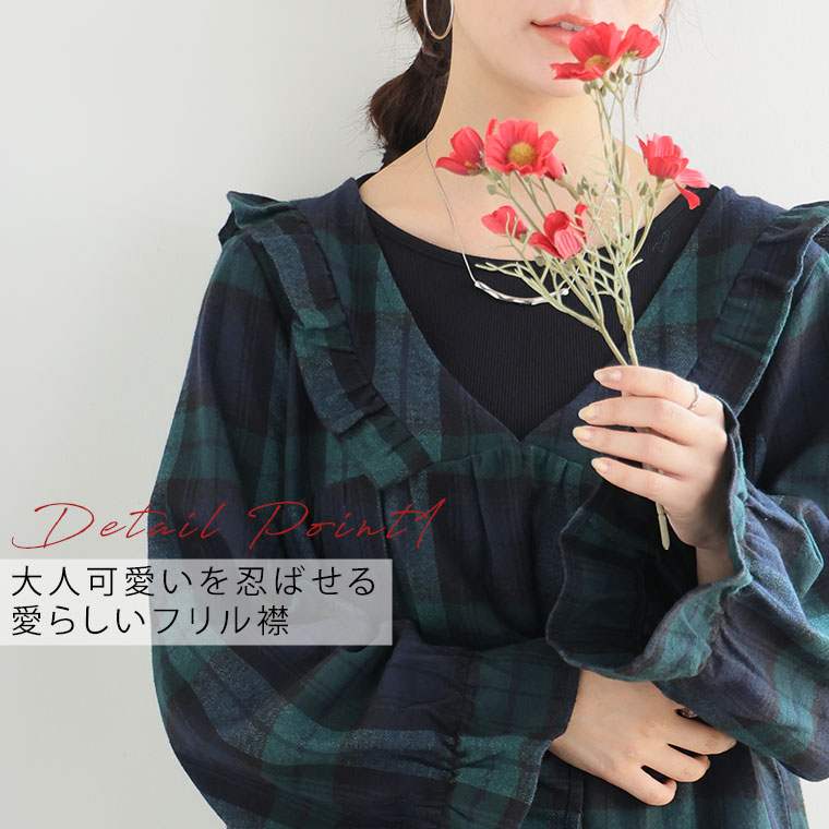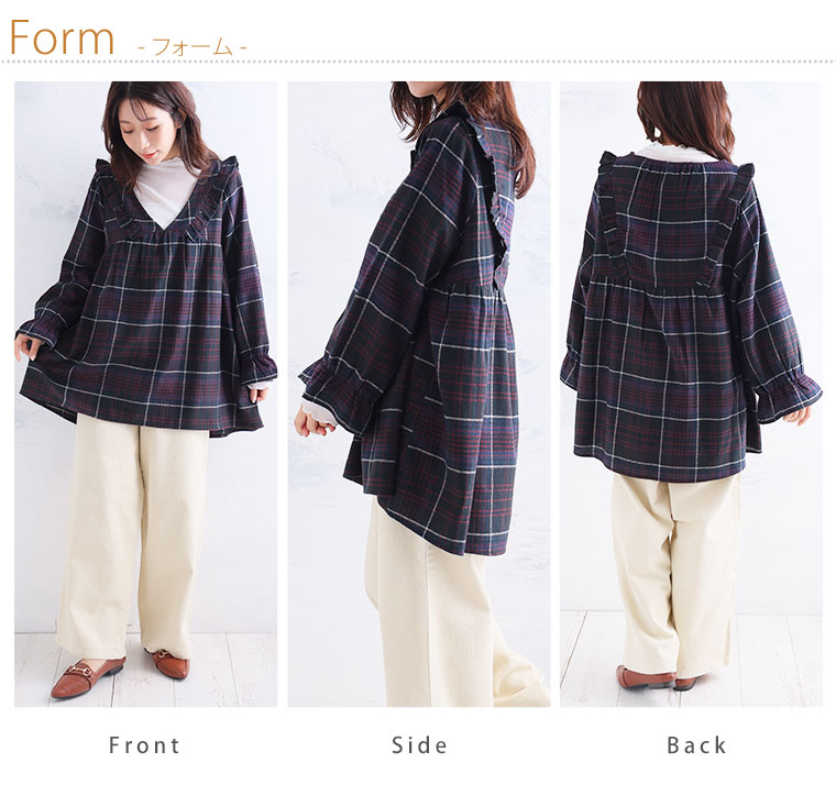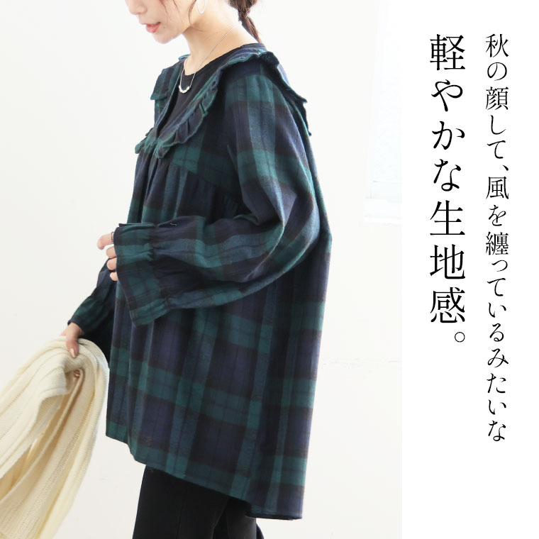 見た目秋、着心地さらりチェック柄ギャザーフリルチュニック