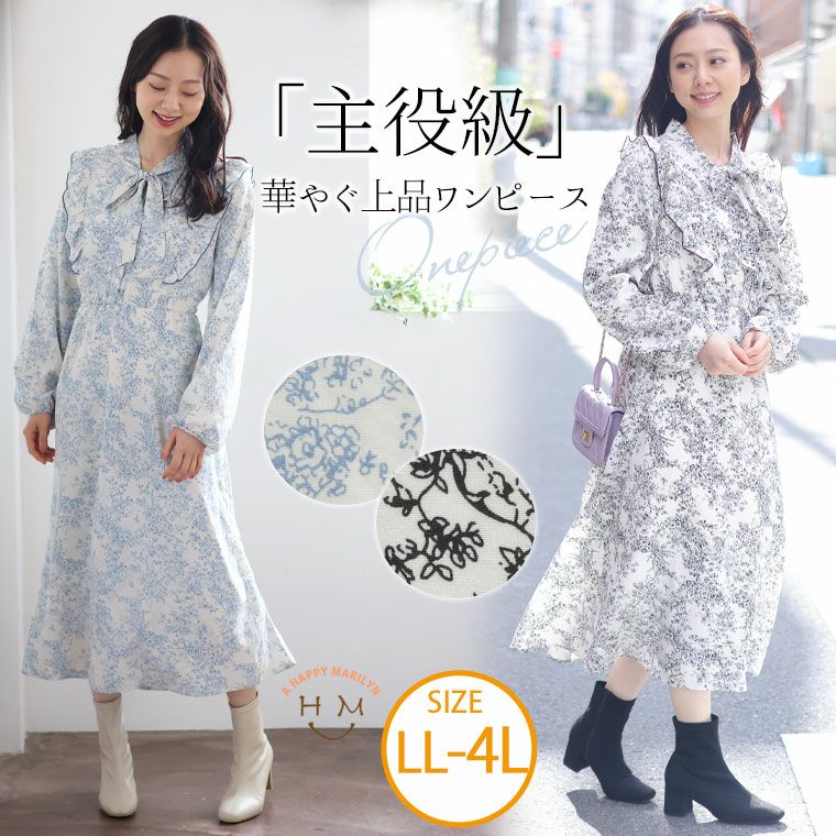 トワルドジュイ柄肩フリル&リボンタイワンピース
