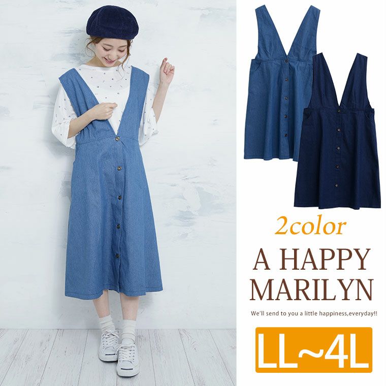Aラインシルエットがふんわり可愛い。ポケット付きひざ下丈デニムジャンパースカート