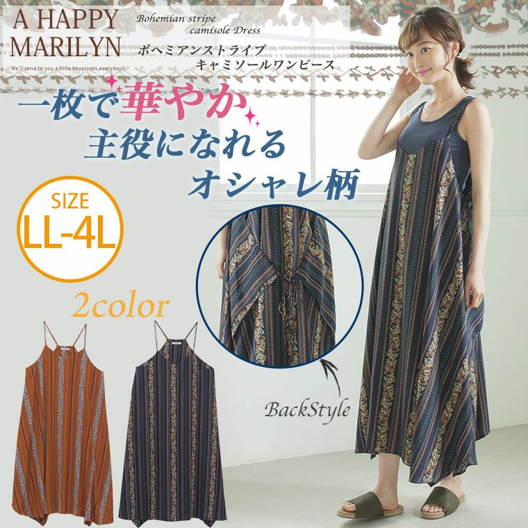 大人っぽい落ち着いたボヘミアンストライプ柄が縦のIライン効果で細見せを期待させるキャミワンピ