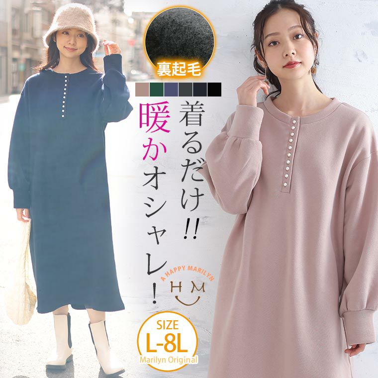 着るだけ暖かオシャレ!裏起毛パールボタンAラインワンピース