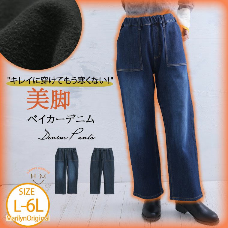 裏フリース美脚ベイカーデニムパンツ