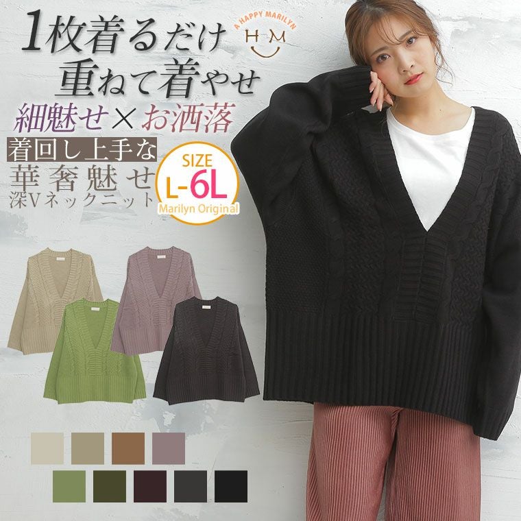 お洒落上手な華奢魅せ美人 深Vネックケーブルニットトップス