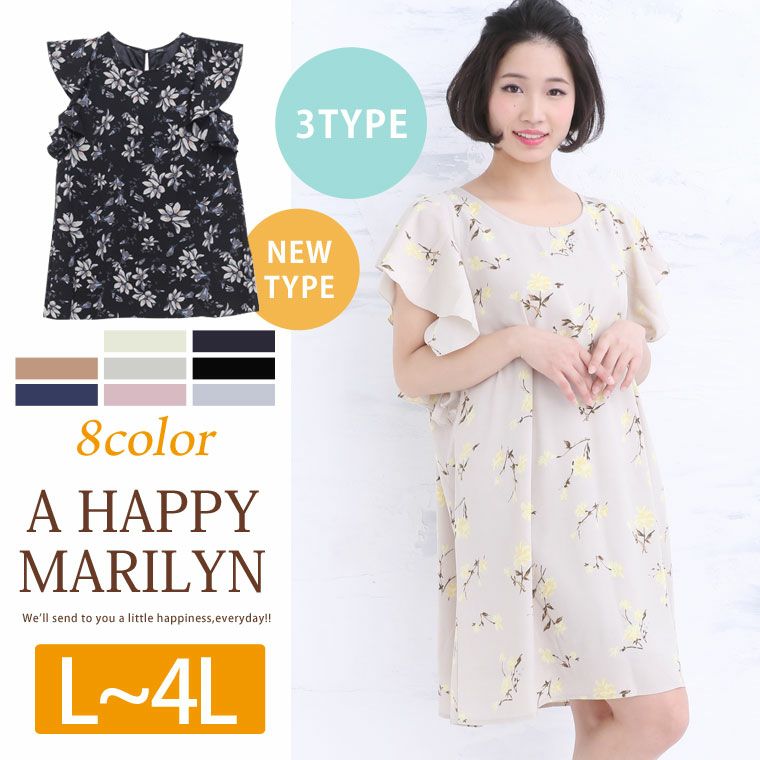 フリル袖で華やかな印象に。無地と花柄3タイプから選べるワンピース