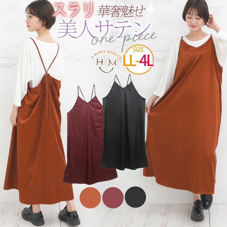 大人上品な無地サテン ダブルストラップキャミワンピース