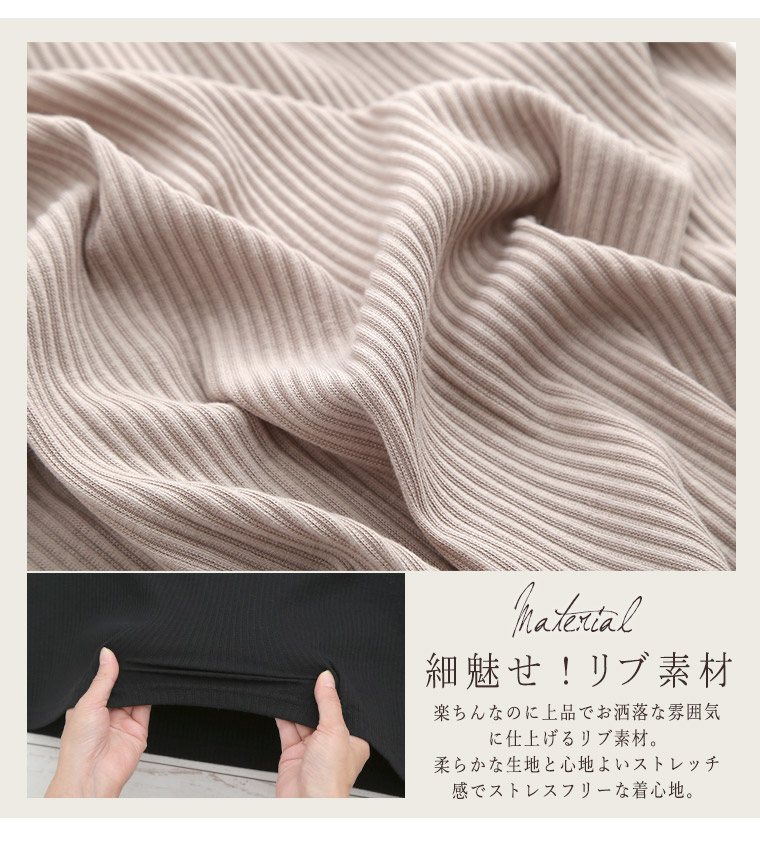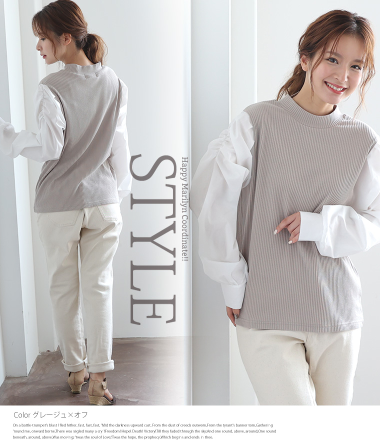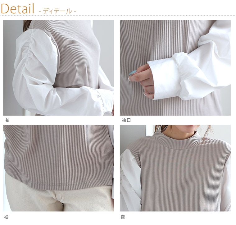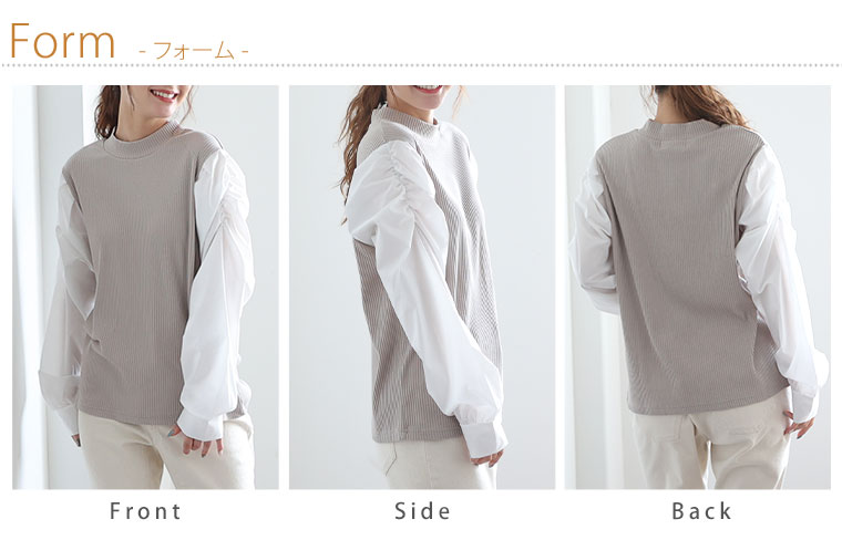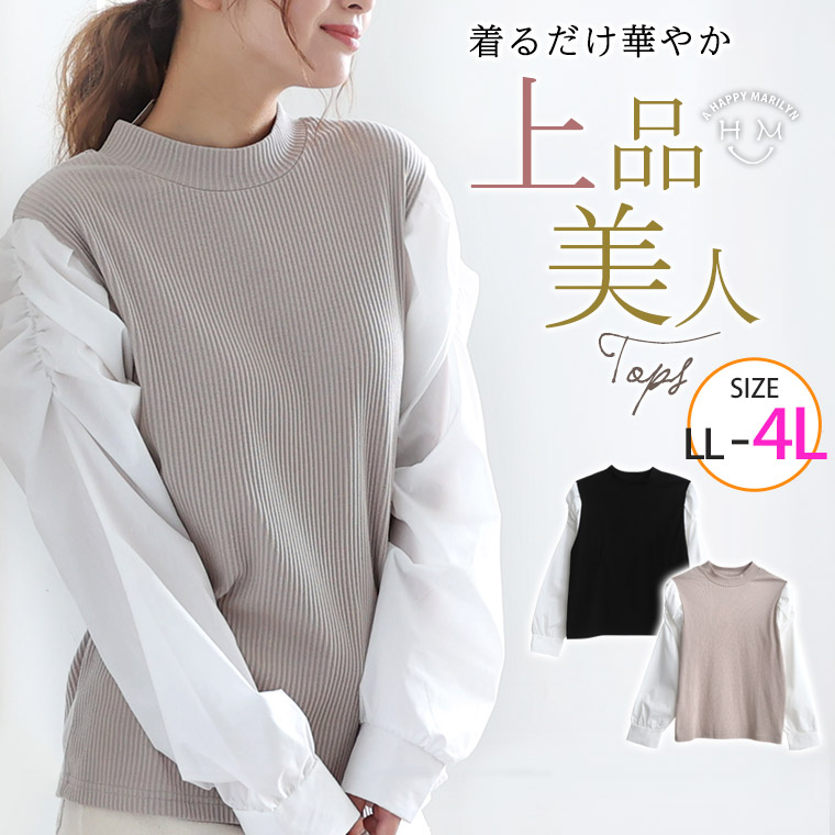 4. 大きいサイズ ギャザー袖 ドッキング プチハイ テレコリブ トップス