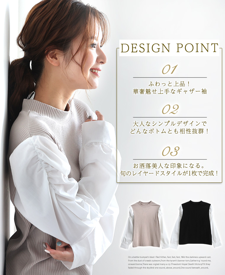 3. 大きいサイズ ギャザー袖 ドッキング プチハイ テレコリブ トップス