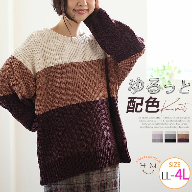 3. 大きいサイズ ベロア モール 畦編み バイカラー ニット | 大きいサイズの通販ならハッピーマリリン