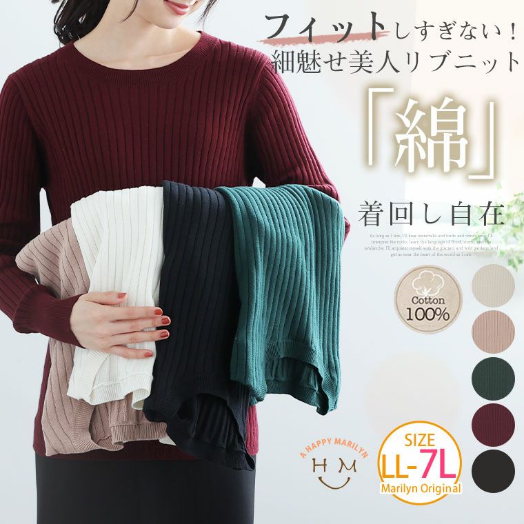 綿100% 着回し抜群ラウンドネックリブニット