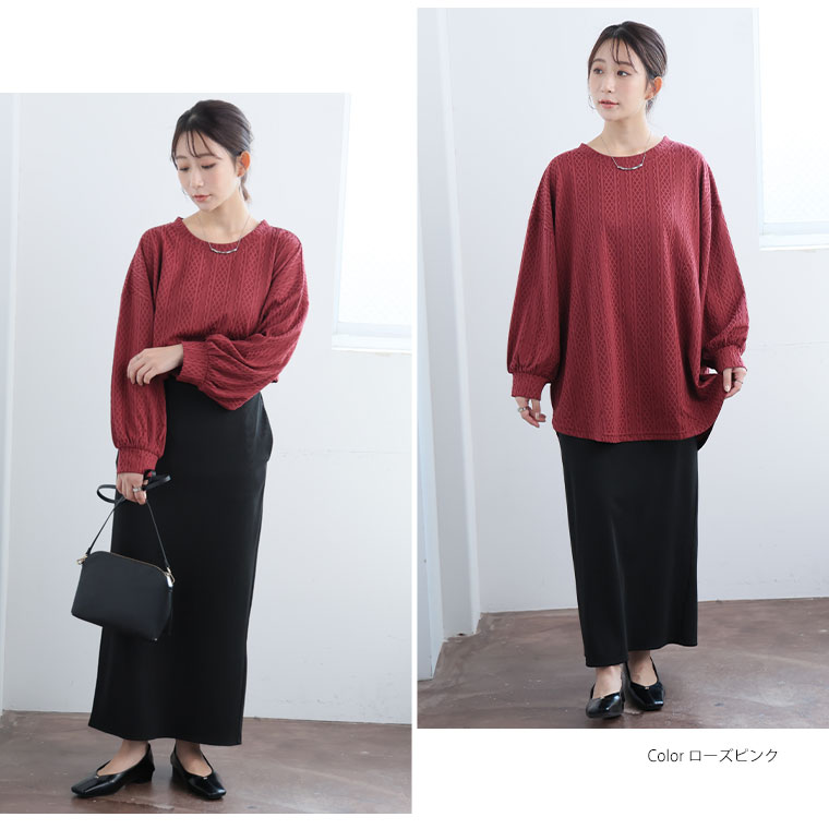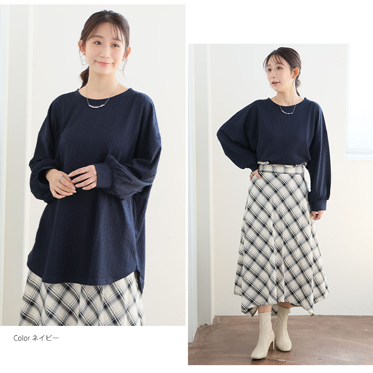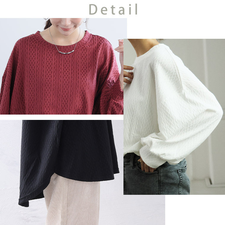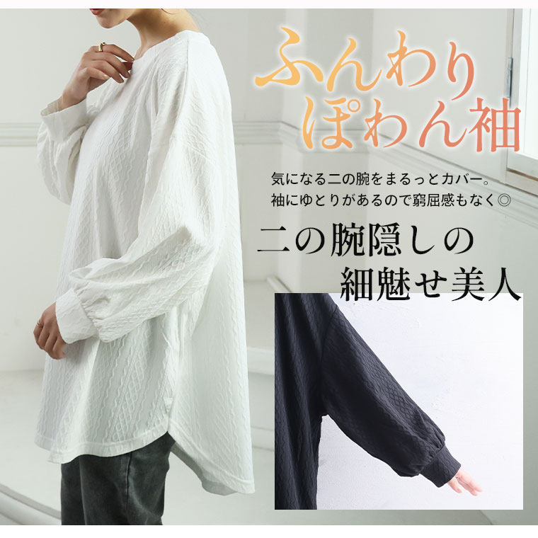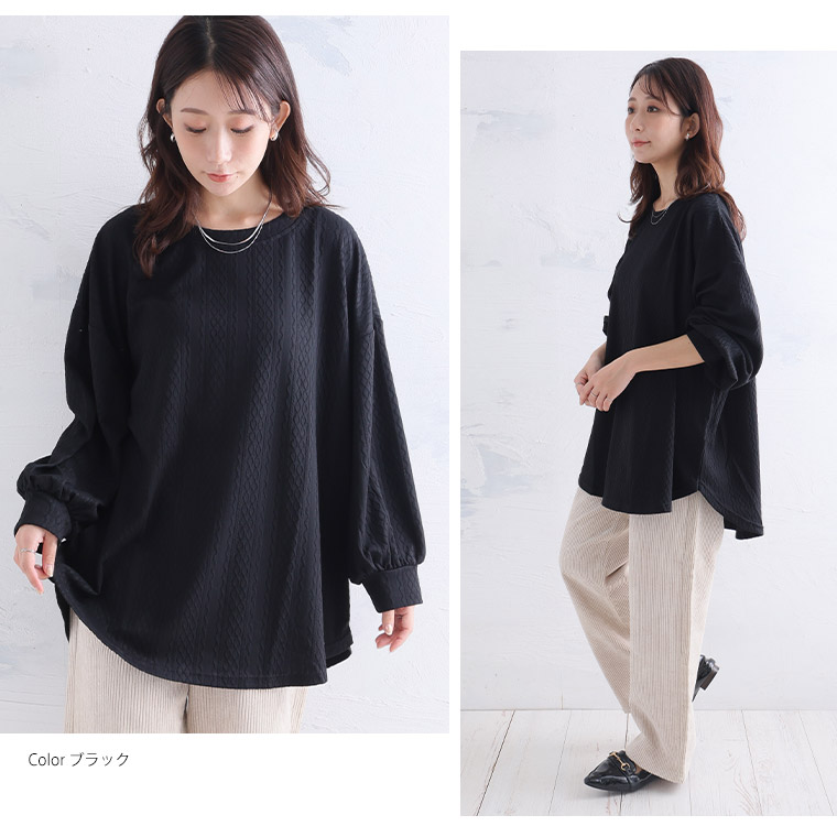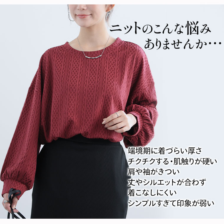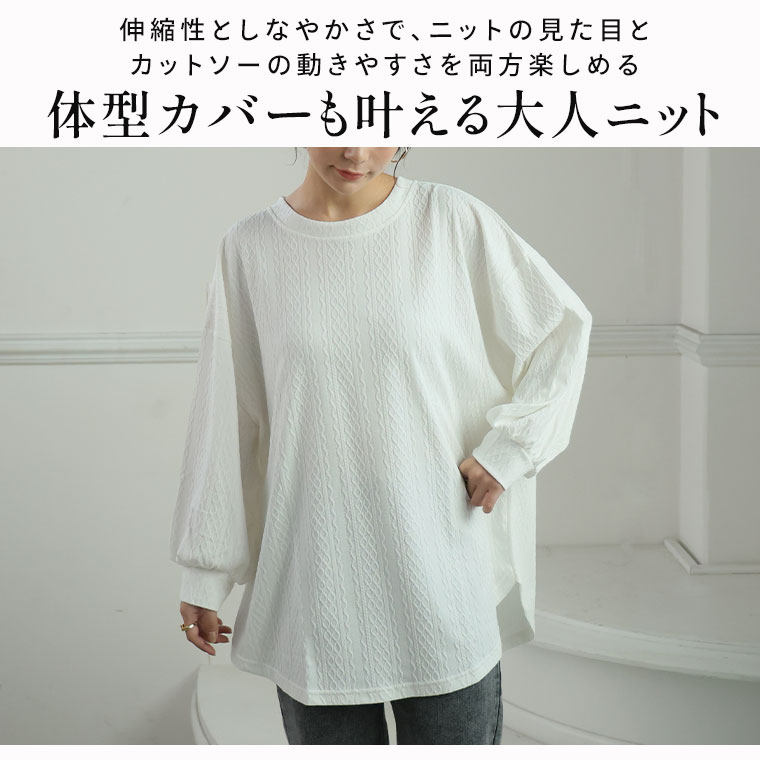 カットソー LL 3L 4L 5L 6L 長袖 秋 秋物 秋服 冬 冬物 冬服 ぽっちゃり ゆったり プラスサイズ お腹 お尻 二の腕カバー ニットとカットのいいとこどり! ケーブルニットソー ぽわん袖 プルオーバー ストレッチ