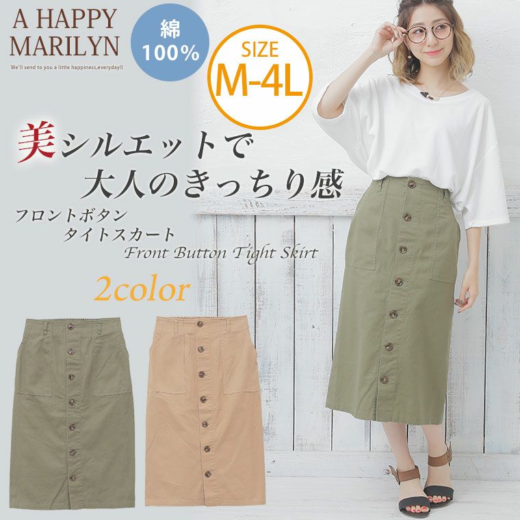 スッキリとしたシルエットに。フロントボタンがアクセントの膝下丈タイトスカート