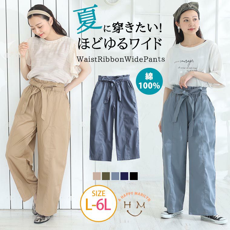 ウエストリボンがアクセントのワイドパンツ