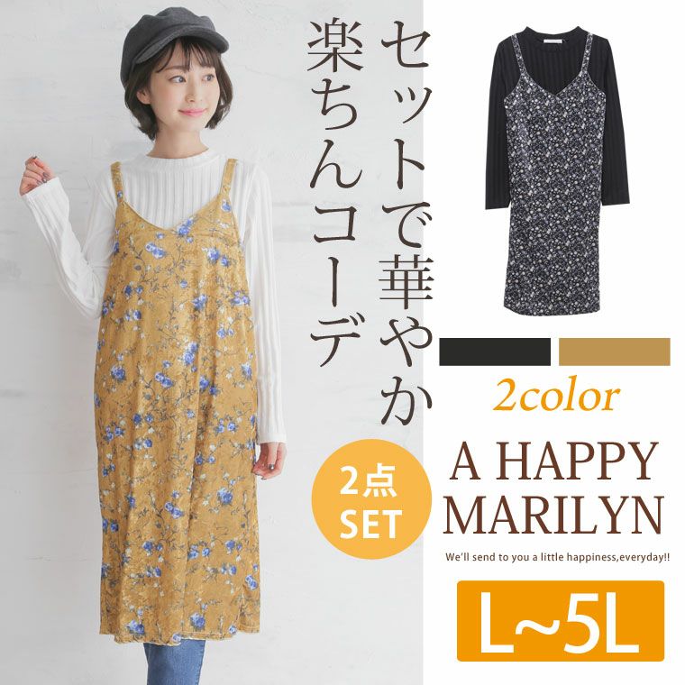 プチハイネックリブトップス+花柄ベロアキャミワンピの2点セット