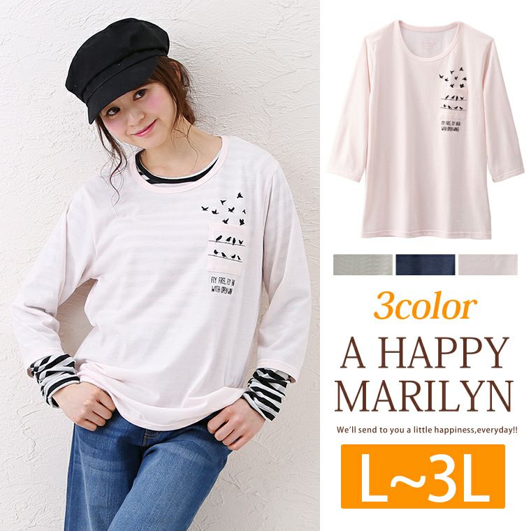 バードプリント&英字刺繍が可愛い♪胸ポケット付き七分袖カットソー