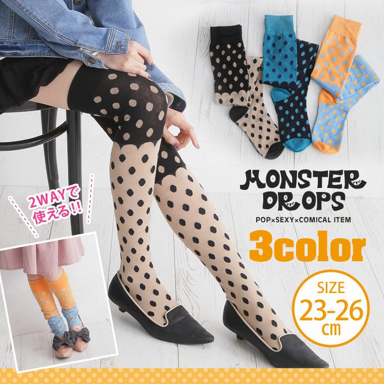 ポップなドット柄がキュートな印象に!!2wayで使えるニーハイソックス
