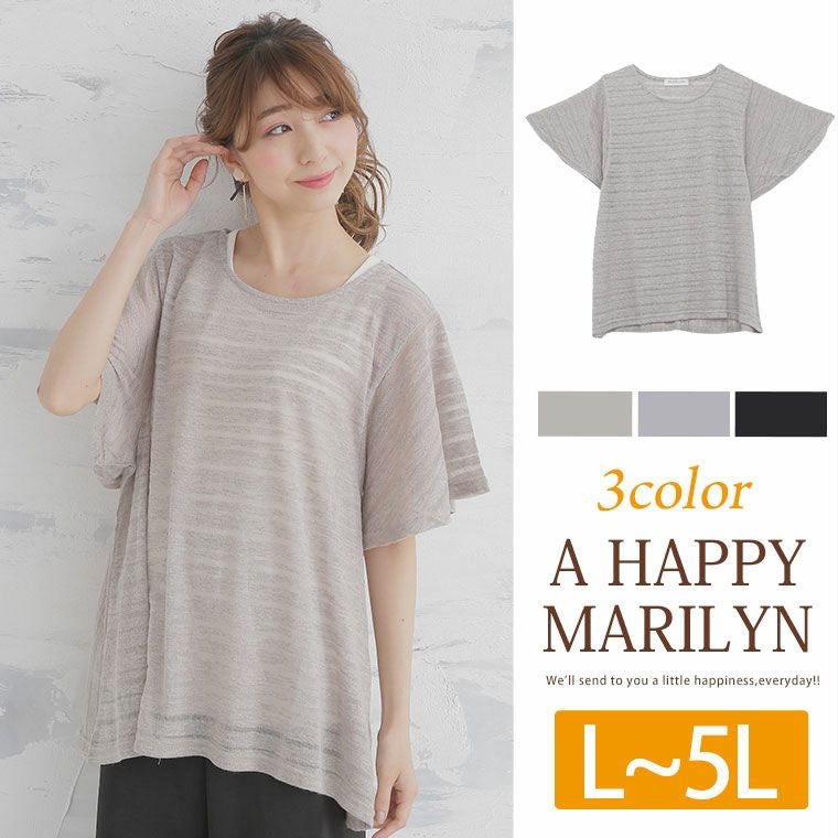 程よい透け感のあるシャドーボーダーが涼しげな印象。フレアスリーブ五分袖トップス