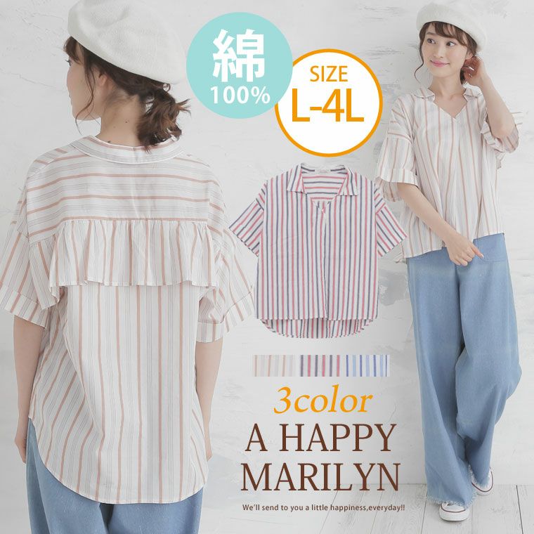 爽やかなマルチストライプで着痩せスタイル♪後ろフリルスキッパーシャツ