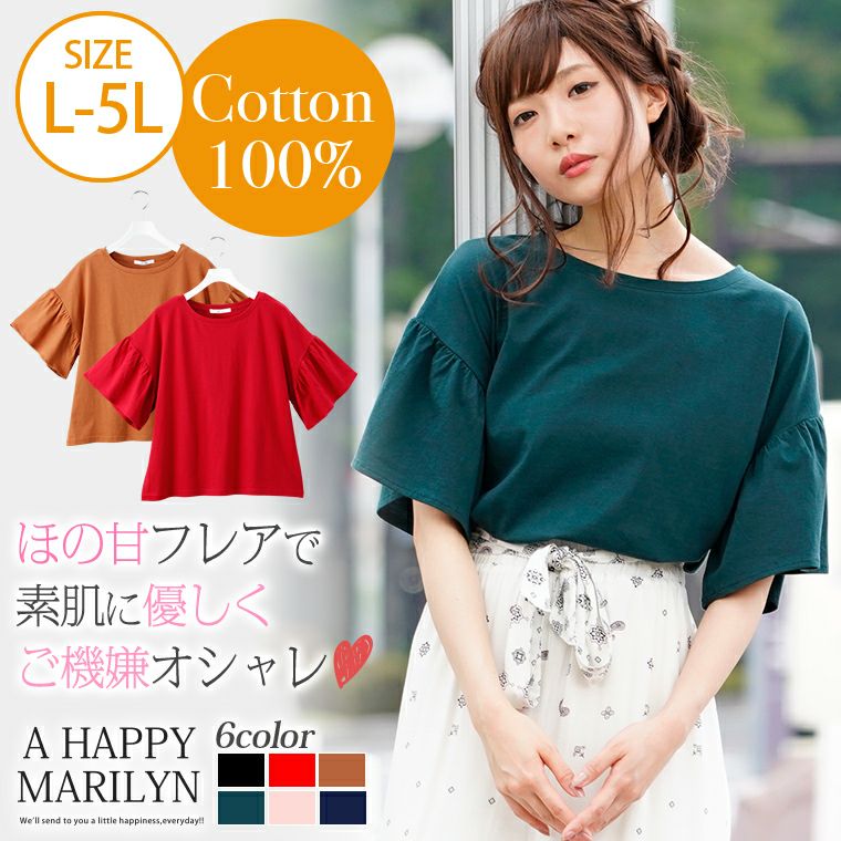 4. 大きいサイズ コットン100% フレアスリーブ クルーネック 半袖 Tシャツ | 大きいサイズの通販ならハッピーマリリン