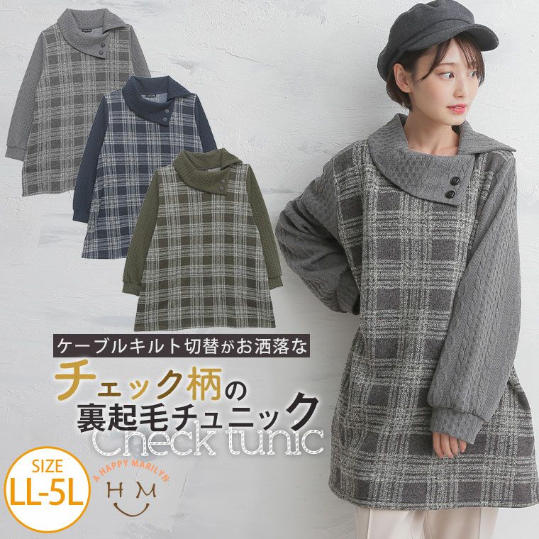 チェック柄が目を惹く ケーブルキルト切替がお洒落なチュニック